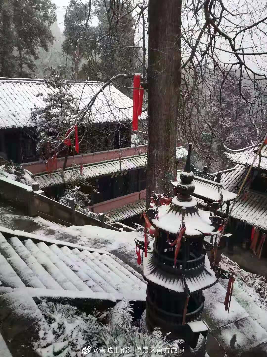 据悉,目前“青城山-都江堰”景区正常开放,青城山山上温度为-1℃-0℃。前去赏雪的市民朋友请做好防寒措施,行走途中注意防滑。