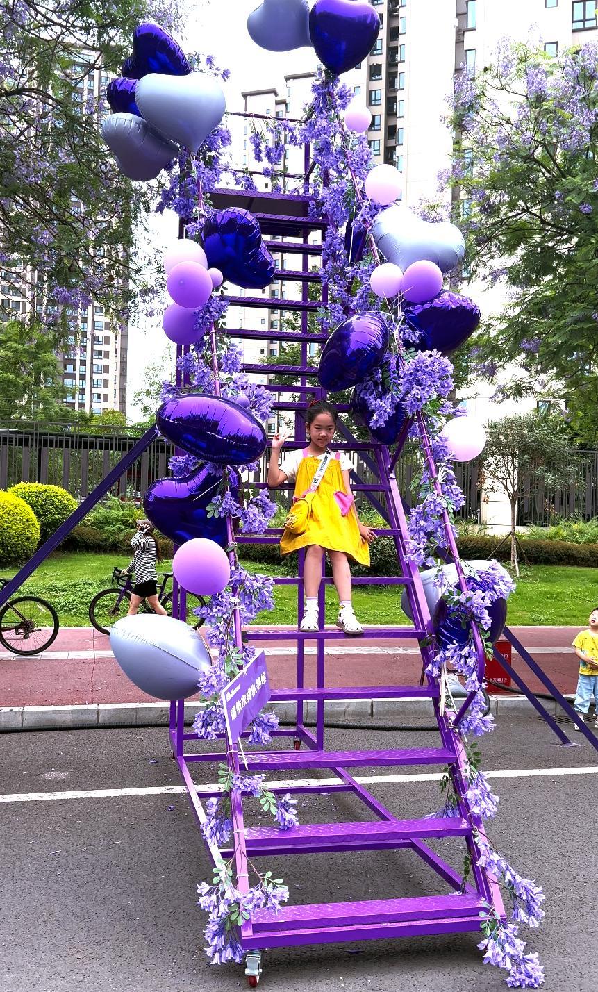 这条蓝花楹大道的惊艳绽放,背后是眉山园林人的精心培育。今年,眉山市住建部门以 “紫色浪漫” 为主题,深度挖掘蓝花楹景观价值,推出系列沉浸式体验活动。在阜成路东五段启明星小区外墙,一条300米长的蓝花楹主题景观道全新亮相。艺术墙画与创意涂鸦沿道铺展,勾勒出蓝花楹的绰约风姿,特制云梯更成为绝佳拍摄点,无论是氛围感十足的单人写真,还是欢乐洋溢的亲友合影,随手一拍都是 “大片”。