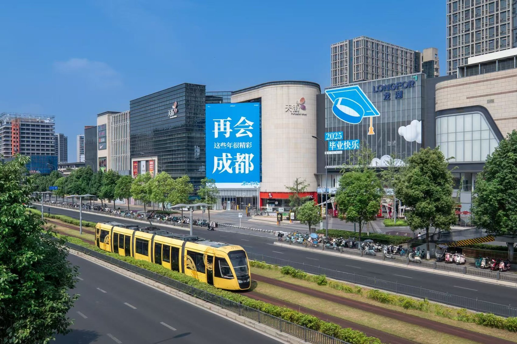 5月23日上午,记者乘坐有轨电车蓉2号线前往电子科技大学清水河校区,快到合作路站时,被一旁建筑幕墙上的巨幅海报吸引。幕墙上“这些年很精彩,再会成都”“2025毕业快乐”的海报,吸引了不少毕业生合影留念。