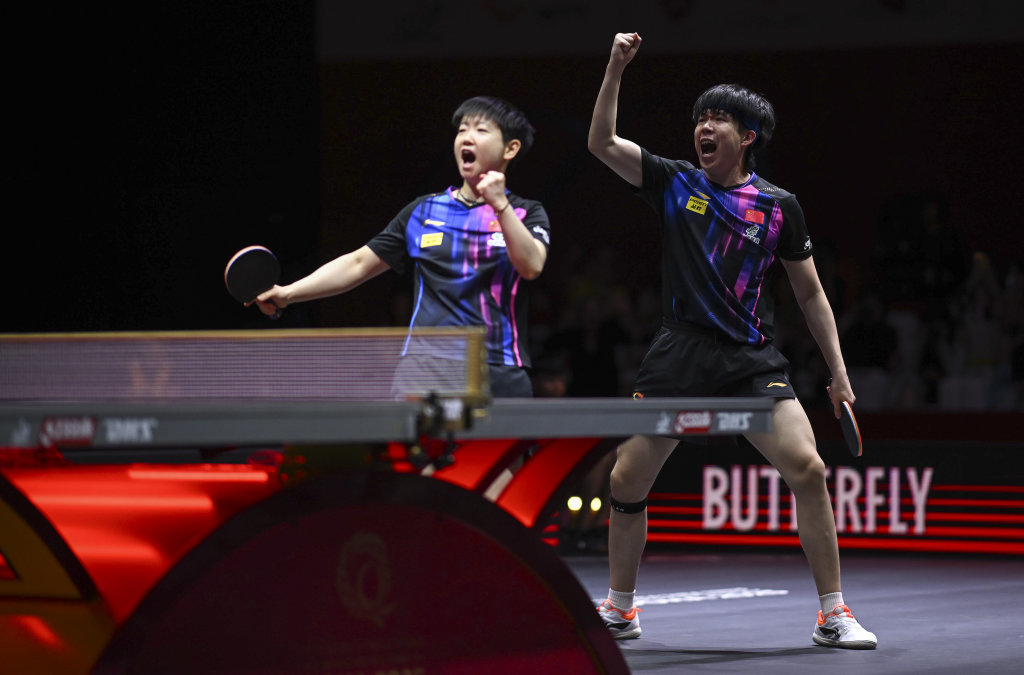 5月24日,王楚钦(右)/孙颖莎在比赛中庆祝得分。新华社记者 肖艺九 摄