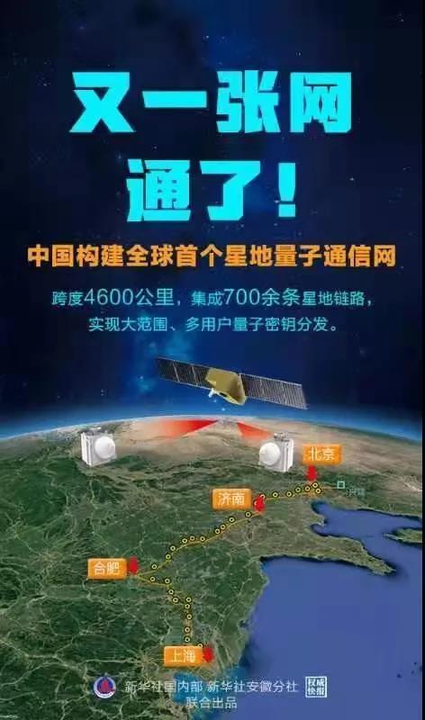 “墨子号”牵手“京沪干线”,中国科学技术大学潘建伟、陈宇翱、彭承志等与中科院上海技术物理研究所王建宇研究组、济南量子技术研究院及中国有线电视网络有限公司合作,构建了全球首个星地量子通信网。经过两年多稳定性、安全性测试,实现了跨越4600公里的多用户量子密钥分发。