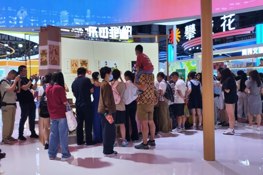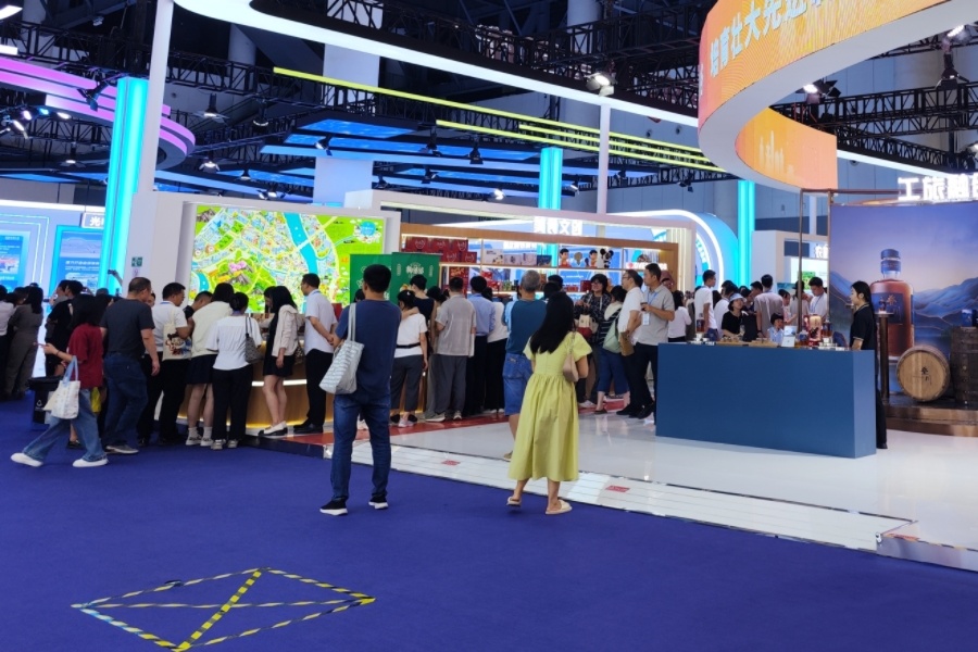 “咚……”在“世界重要旅游目的地与区域消费提升”展区内,乐山大佛场景撞钟祈福体验区吸引了不少游客的目光,该体验区采用乐山大佛卡通形象,配以敲钟的互动方式。在三面屏沉浸互动体验区,通过地面三个雷达感应,观众踩击可进行飞跃峨眉山、穿越乐山、乐山三千年大事记三面屏场景切换,缆车座椅沉浸式VR体验打卡,感受乐山深厚的文化底蕴和迷人的文旅风光。此外,游客还可在非遗体验区动手制作夹江年画、峨眉山蝶翅画、面塑等。不远处的美食体验区已排起了长龙,人们只为一尝钵钵鸡、绵绵冰、甜皮鸭等乐山风味。