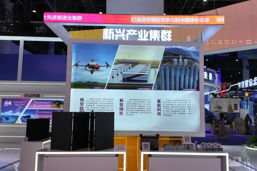 “中国绿色硅谷与先进制造业”展区,集中展示乐山在工业发展、技术革新方面的新成果。酷炫的无人机映入眼帘,直观展现了乐山在低空经济发展的潜力;乐山伟力得、新天源、航达科技、海创尚伟等新能源企业也在此展示全钒液流储能系统模型、太阳能背包、折叠充电包等新型应用产品;全球首座溶液型医用同位素实验堆模型展示核医疗产业的蓬勃动力。
