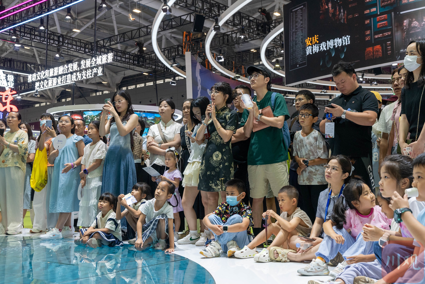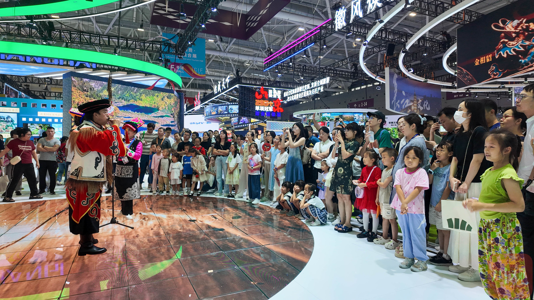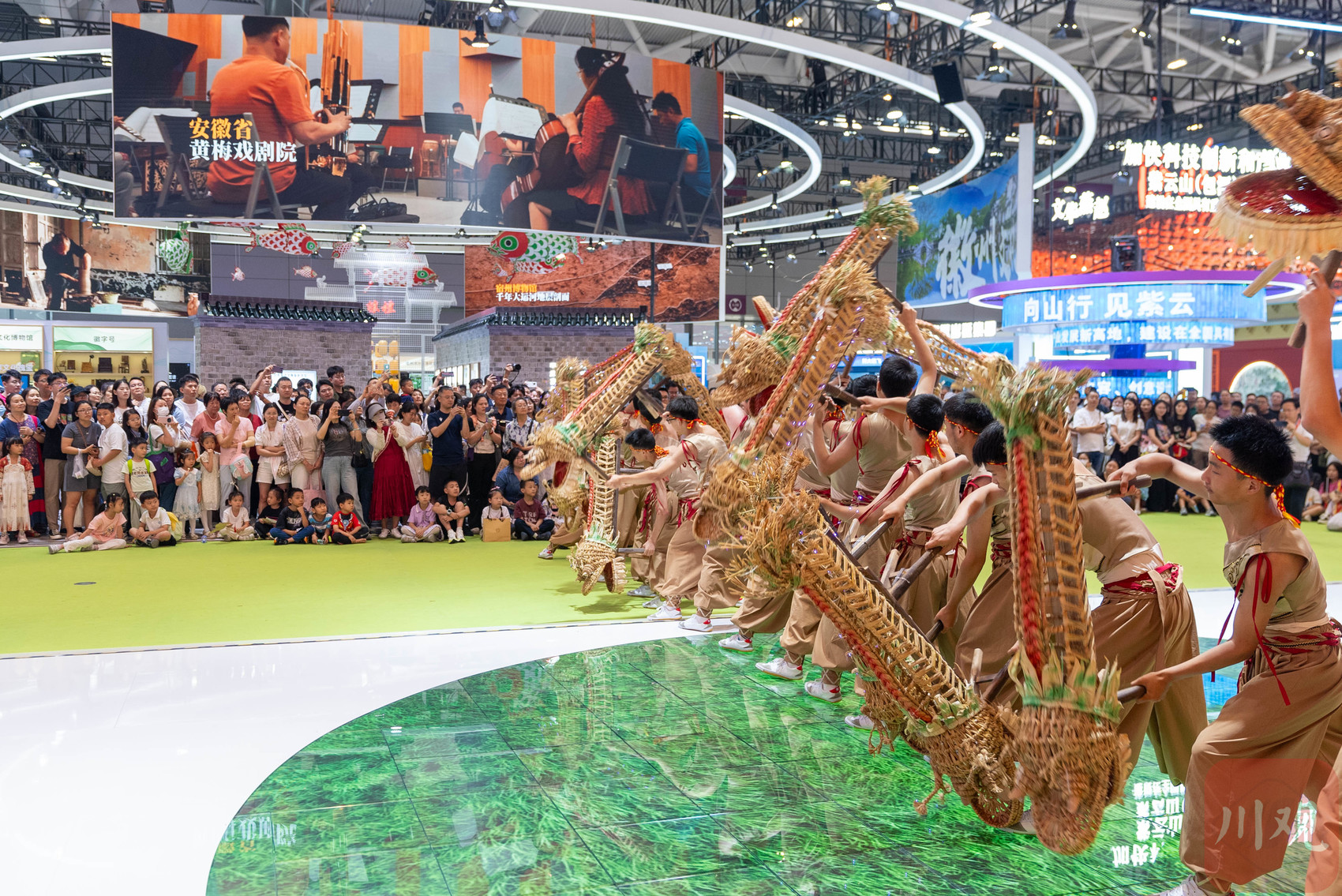 5月25日,观众们聚集在四川展馆场边欣赏非遗文化表演。