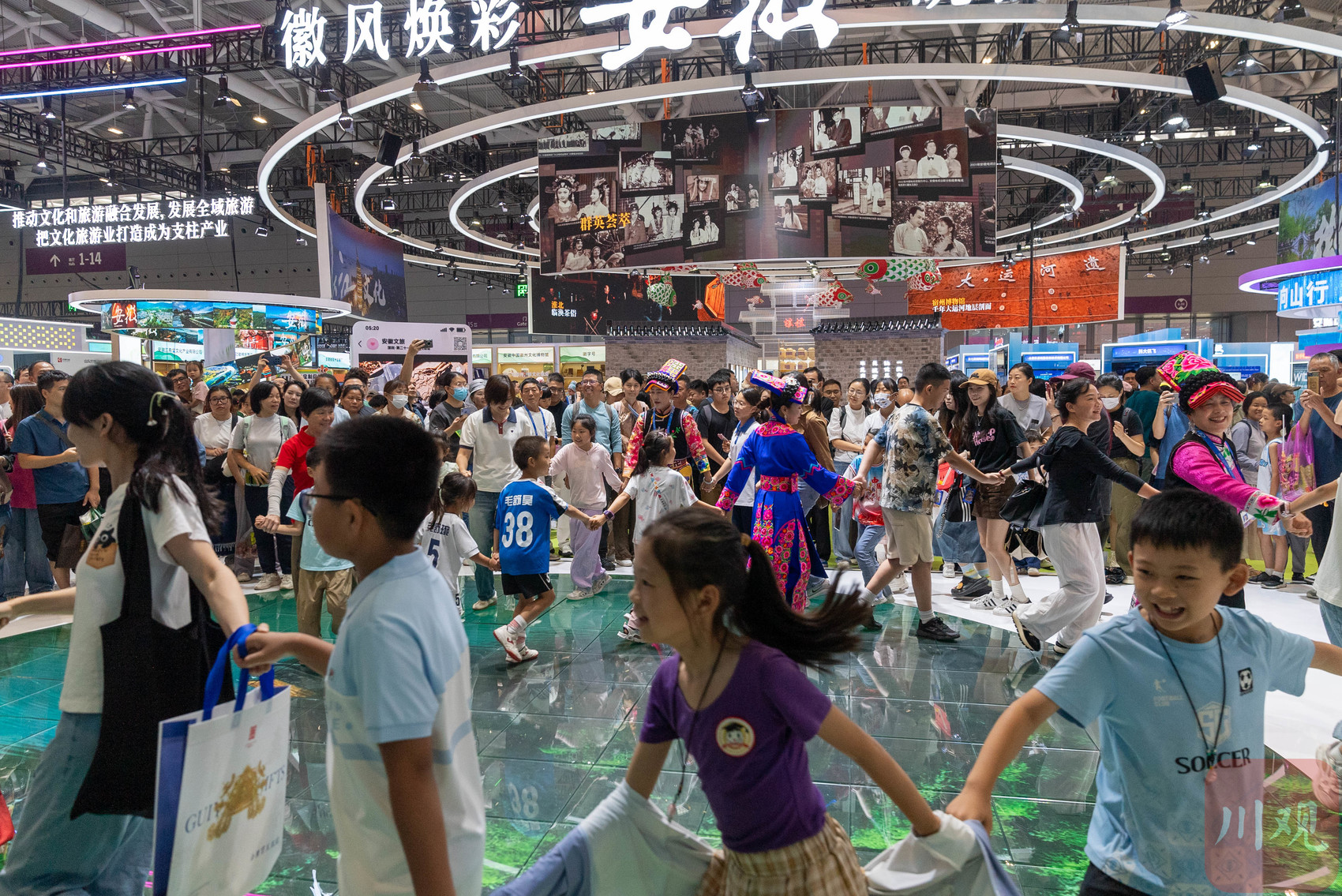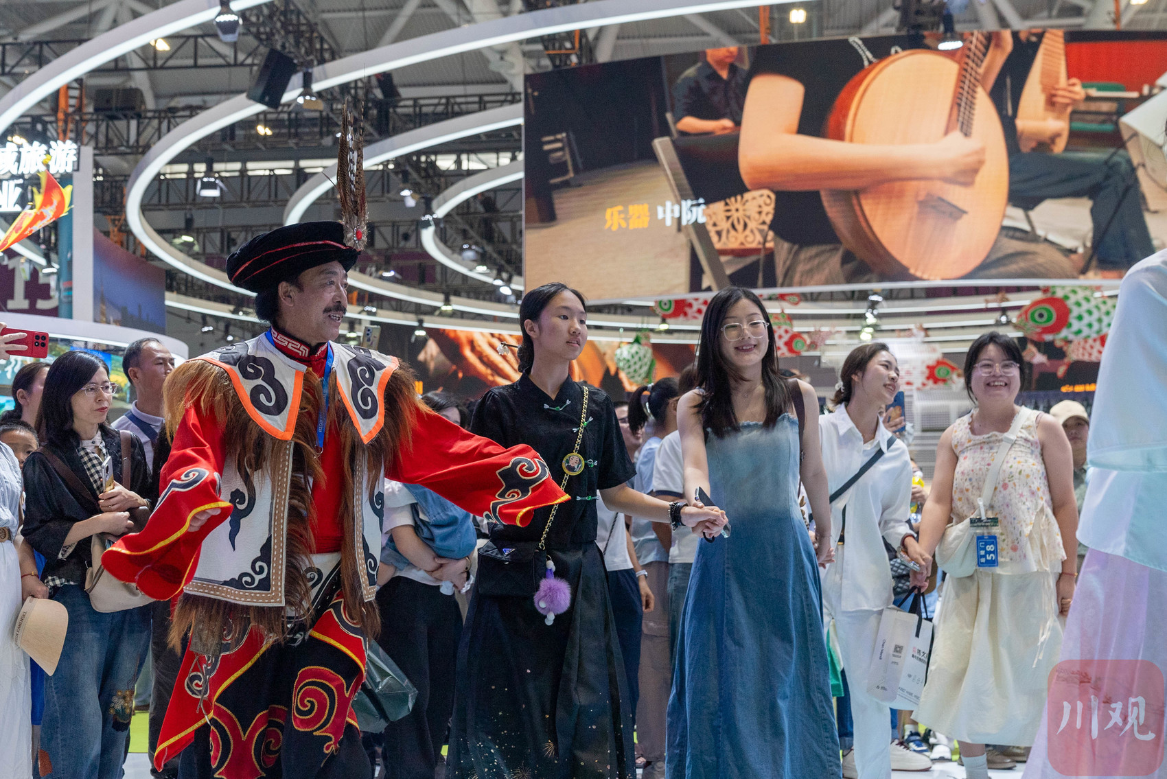 5月25日,四川展馆内,羌族艺人和现场观众一起跳起沙朗锅庄。