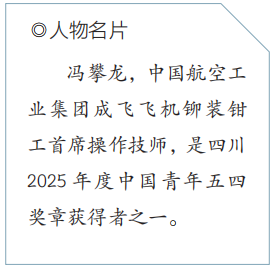 2025年4月30日,冯攀龙在北京领到中国青年五四奖章,回成都的路上,他接到公司生产现场的“急救电话”,“下飞机第一时间我就去了现场,连干三天,终于和同事们处理完那个棘手的问题。”记者采访他时,他已回归平凡岗位,继续用手中的铆枪为祖国战鹰“缝制铠甲”。