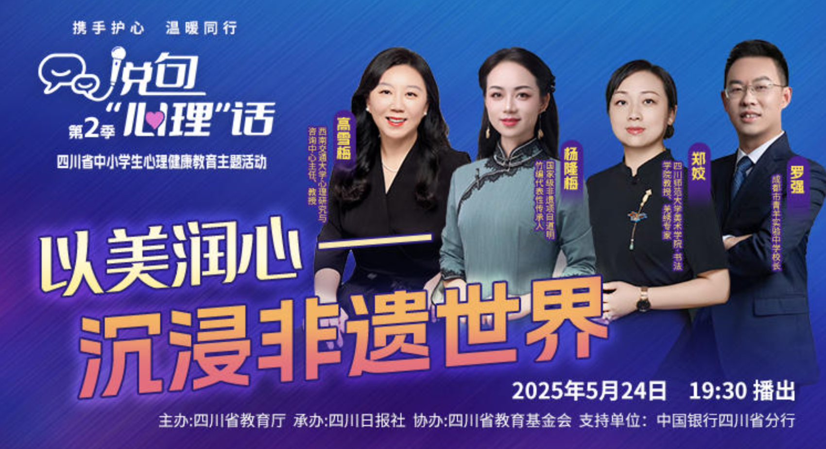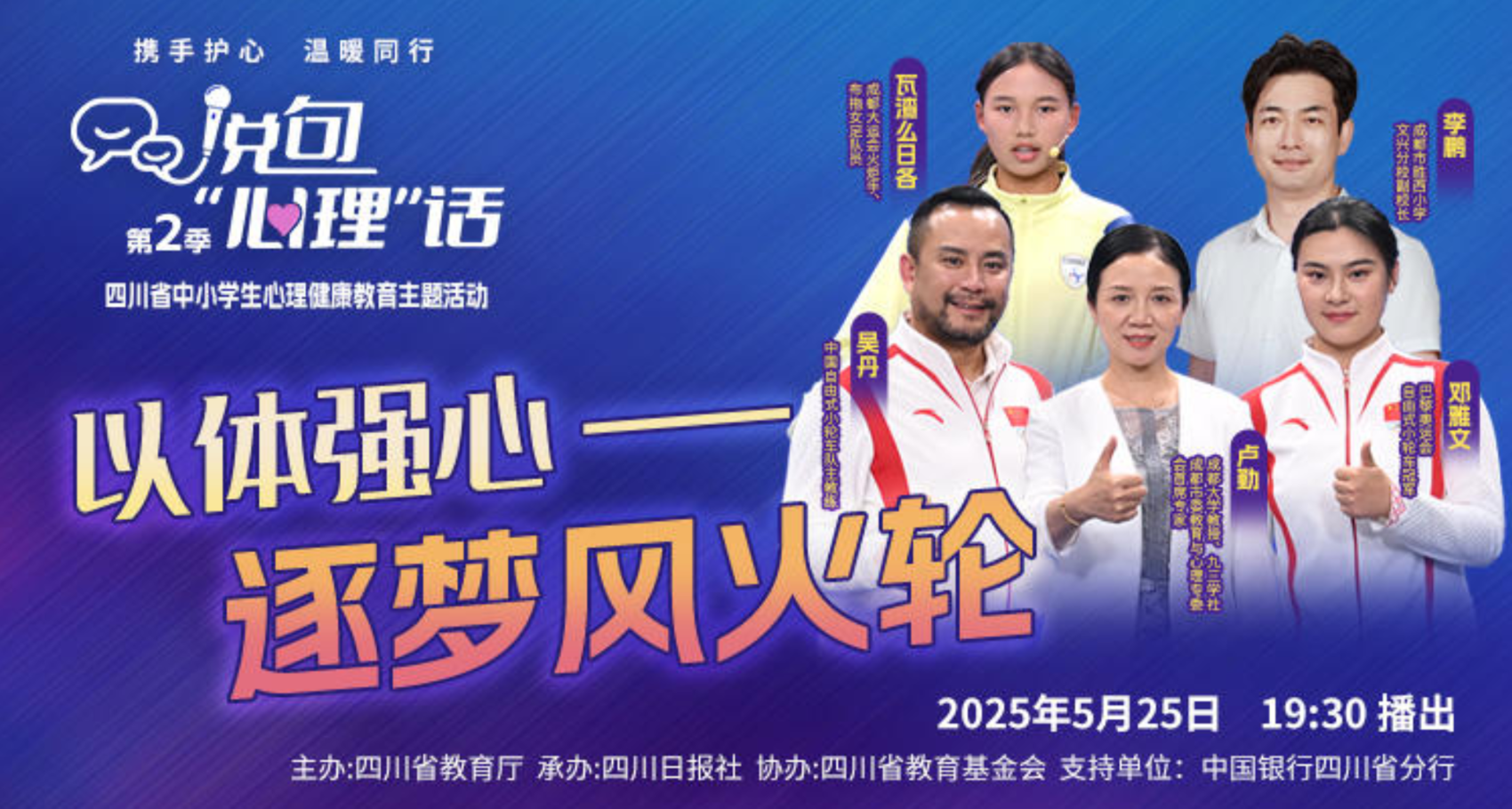 5月24日、25日,由四川省教育厅主办、四川日报社承办、四川省教育基金会协办、中国银行四川省分行支持的“说句‘心理’话——四川省中小学生心理健康教育主题活动”第二季开启,两期视听课《以美润心——沉浸非遗世界》《以体强心——逐梦风火轮》上线播出。奥运冠军、非遗代表性传承人和全川中小学生一起说句“心理”话,两天时间全网150万人次点赞。