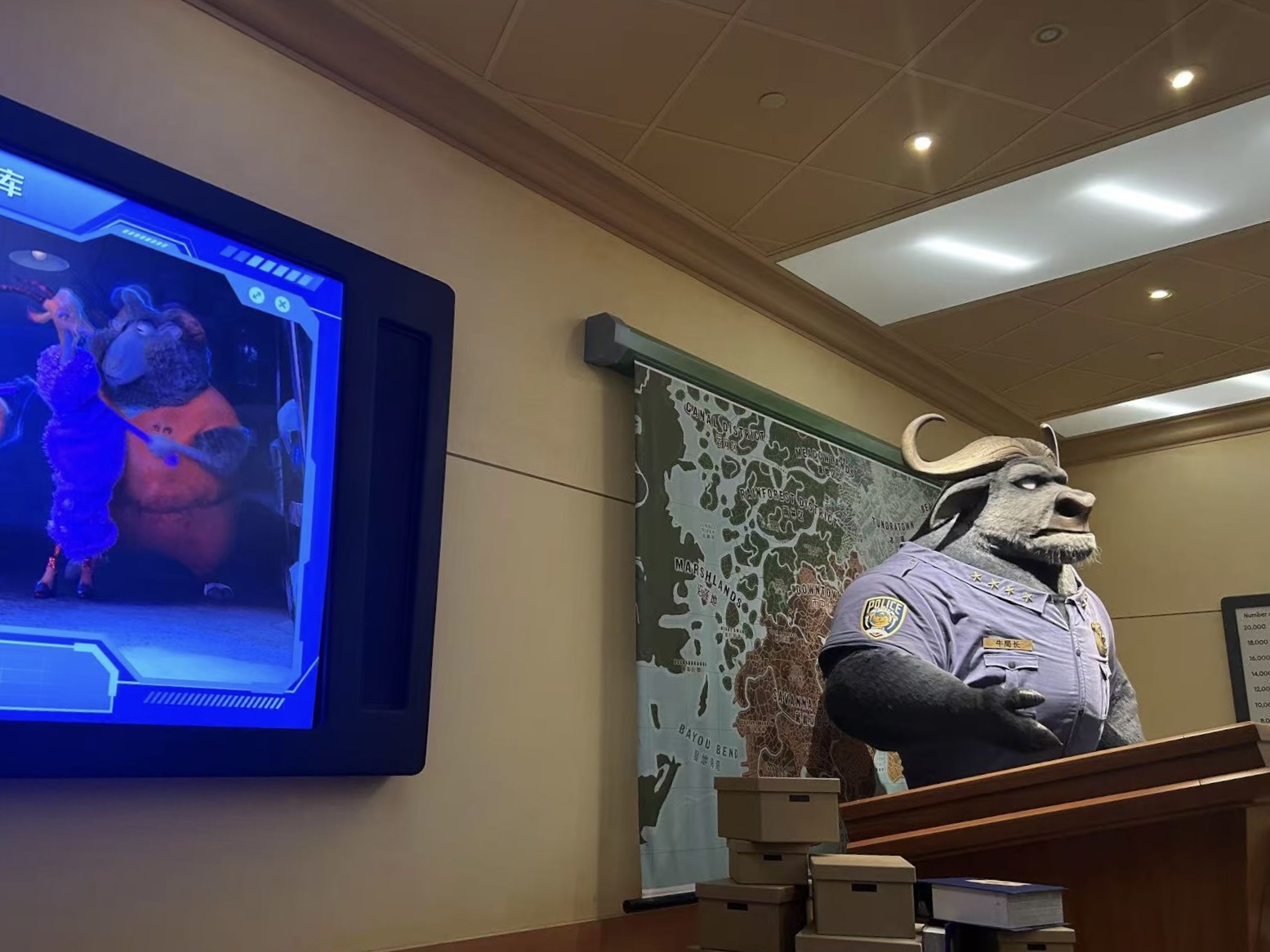 “疯狂动物城”主题园区内的牛局长机械动画人偶。杨婷丹 摄