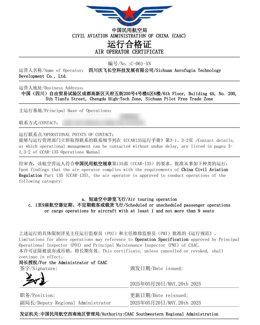 具体来说,沃飞长空已获得由中国民用航空西南地区管理局颁发的CCAR-135部运行合格证,标志着该企业成为国内首家具备了可长期开展短途空中游览飞行,以及1至9座航空器不定期载客飞行资质的eVTOL主机厂,后续可为现有通航运营商快速使用eVTOL开展低空观光与低空运输提供参考路径。