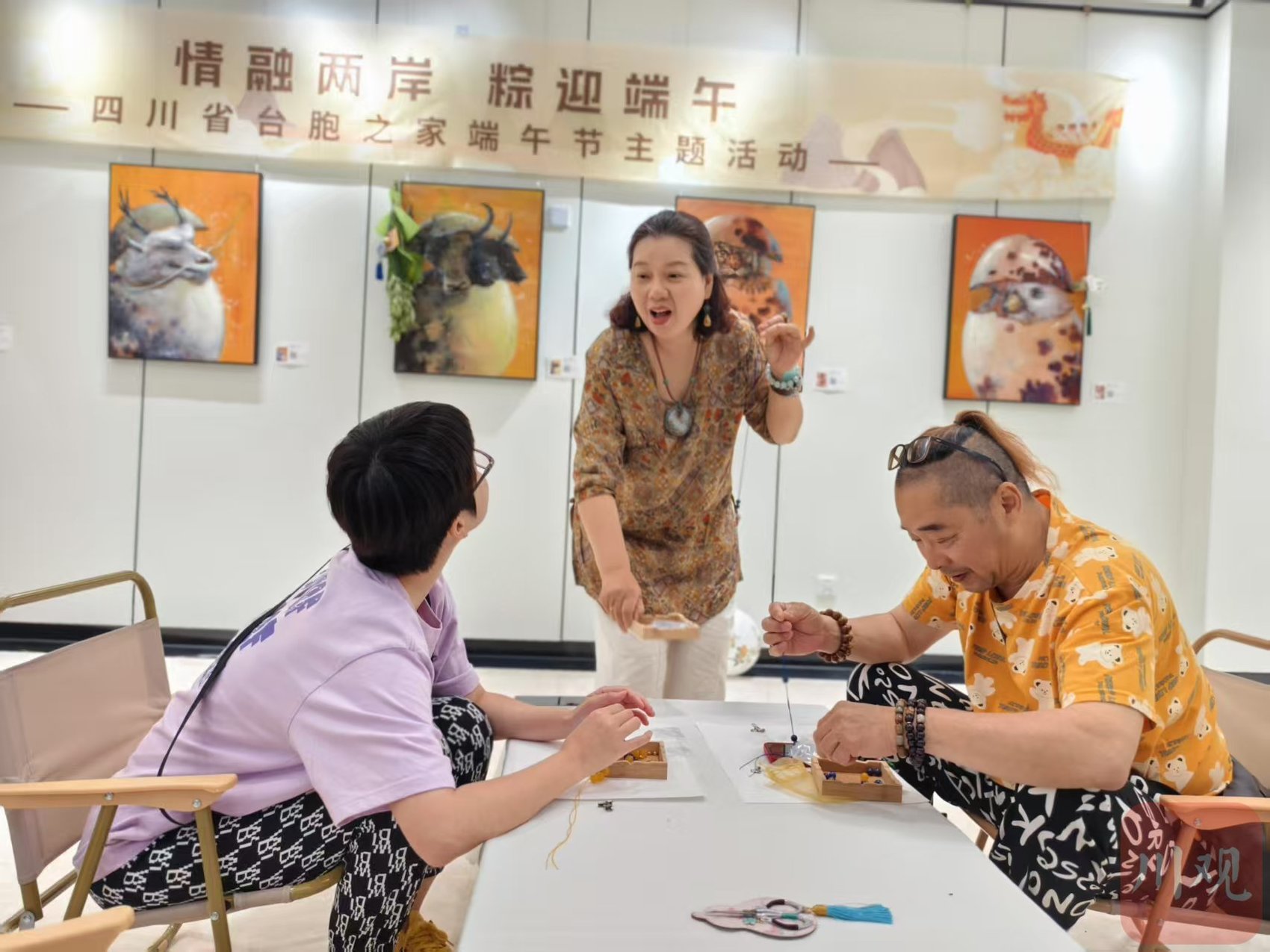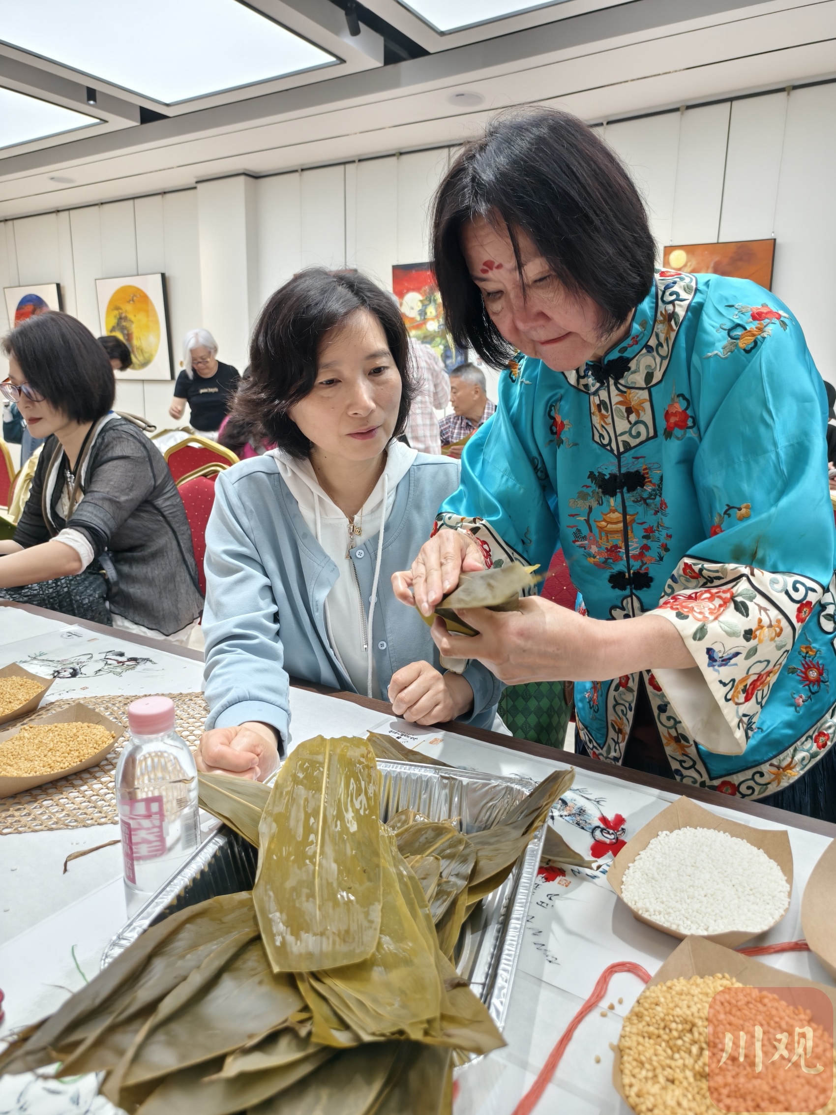 在传统文化体验活动中,两岸同胞围坐在一起包粽子,来自台湾的美食家孙阿姨手把手教四川女婿包台式肉粽,“粽叶要这样折才不会漏米”。
