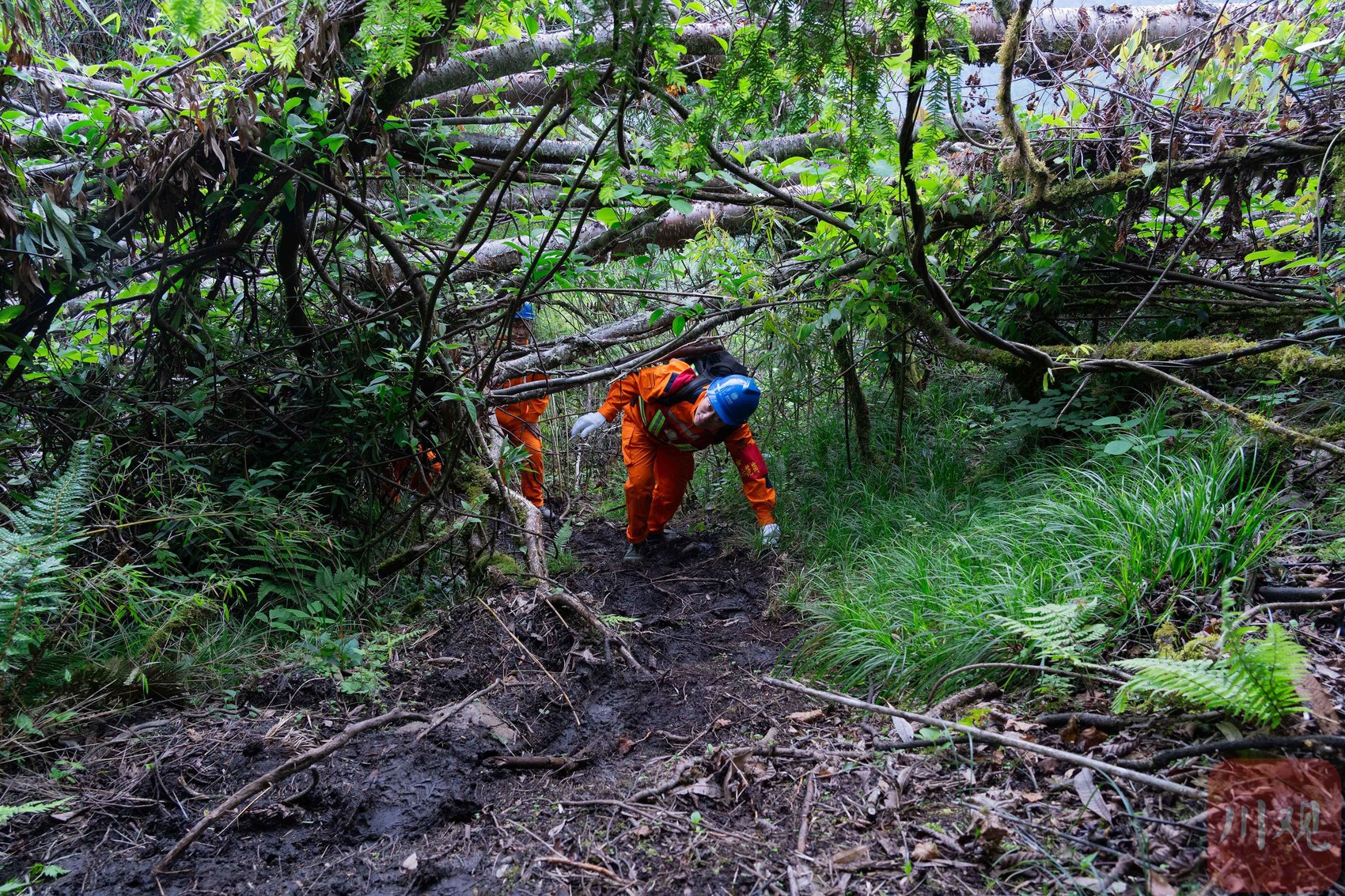 5月26日,国网四川电力送变电建设有限公司工作人员骆宗银行走在泥泞的达杠山丛林。