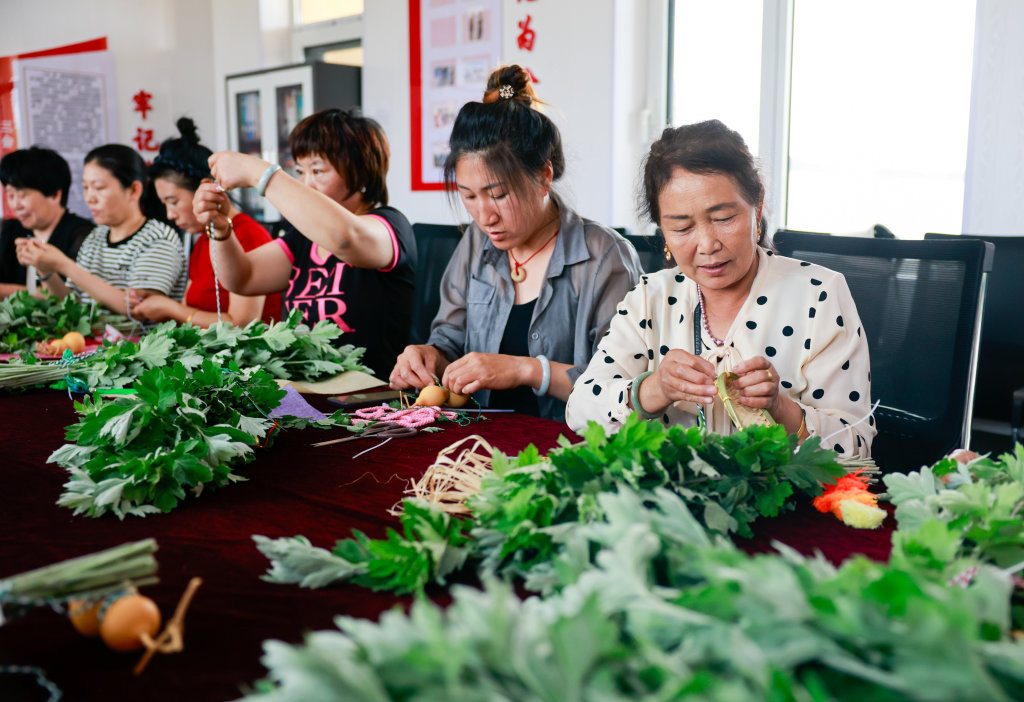 5月27日,村民在河北省唐山市丰南区王兰庄镇高家围村活动中心学习制作艾草挂件。