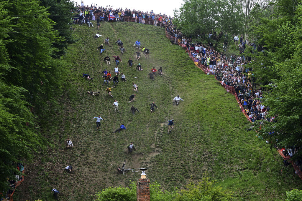 一年一度的滚奶酪大赛是英国格洛斯特郡的一项传统赛事。参赛者奔跑追逐从山坡上滚下的奶酪,最先追到者获胜。