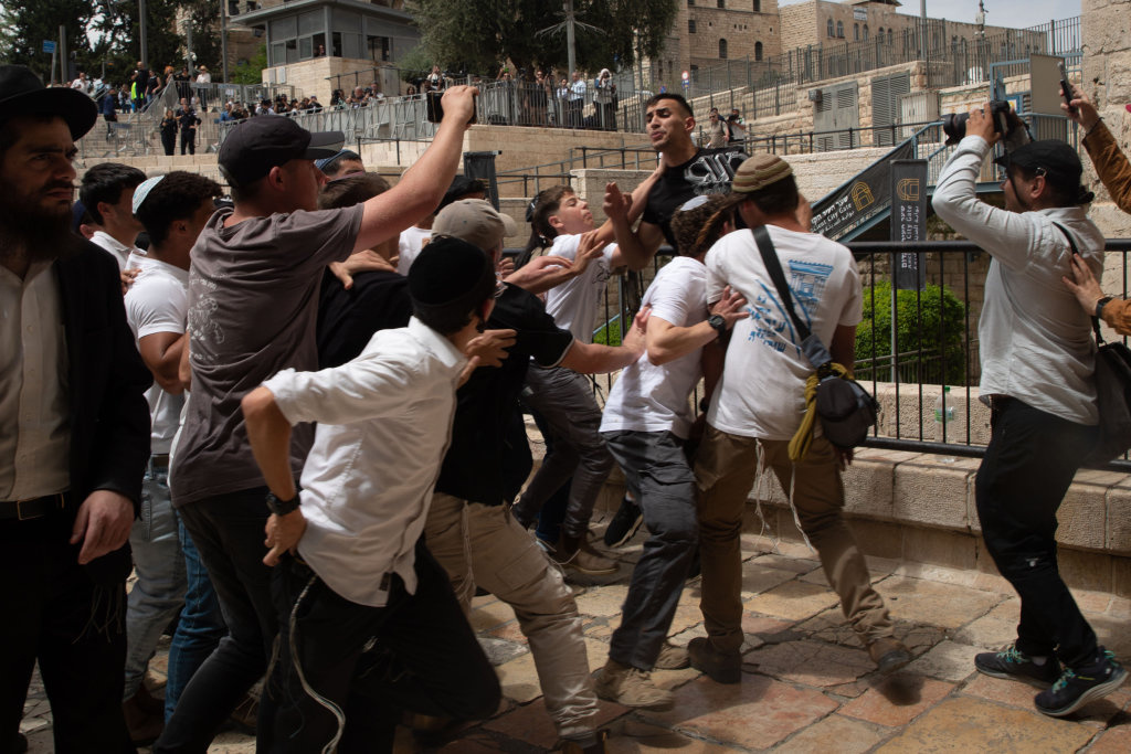 5月26日,在耶路撒冷老城举行的“耶路撒冷日”游行期间,参加游行的以色列极右翼人士与一名巴勒斯坦人(中上)发生冲突。