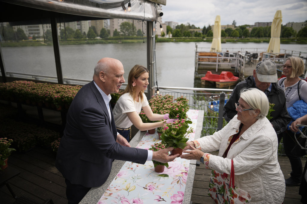 5月26日,在波兰首都华沙,志愿者向人们分发长寿花盆栽。
