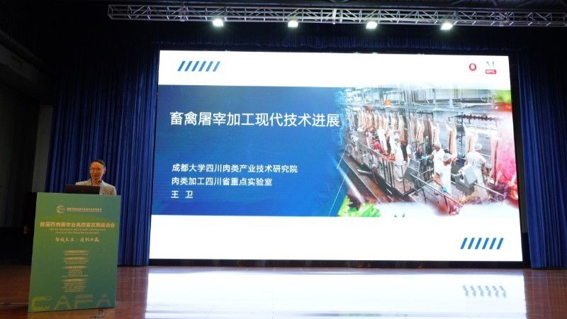 2024年,四川现有生猪规模养殖场(年设计出栏 500头以上)19141家、生猪屠宰企业848家。哪些好技术可以让生猪加工更加绿色清洁、生态环保呢?成都大学四川肉类产业技术研究院院长王卫首先登台。他以《畜禽屠宰加工现代技术进展》为题,系统解析了屠宰加工的技术前沿、产业痛点与未来趋势。作为肉类加工四川省重点实验室主任,王卫还重点介绍了“多位一体”的政、产、学、研、用服务机制运行情况,希望借助该平台向屠宰企业推广一批先进的技术设备,帮助企业更好实现肉类保质保鲜。