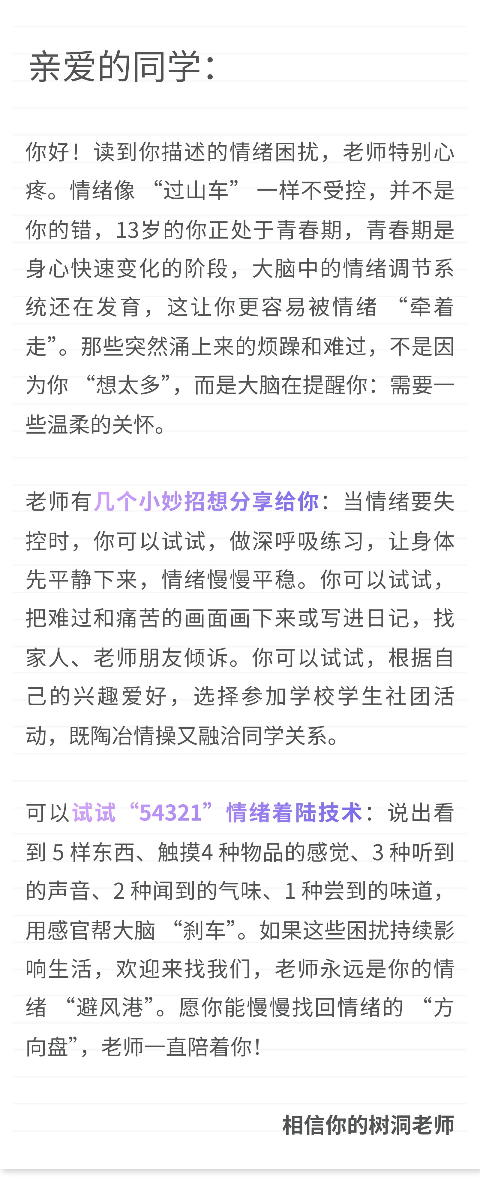 一位13岁初中女生:我总是会莫名其妙地烦躁。上一秒开心,下一秒就难过,很多人都说是我想太多了。但是,我控制不住我的大脑,所以痛苦的事情都在我的脑子里面浮现,让我的情绪很失控、很容易激动。