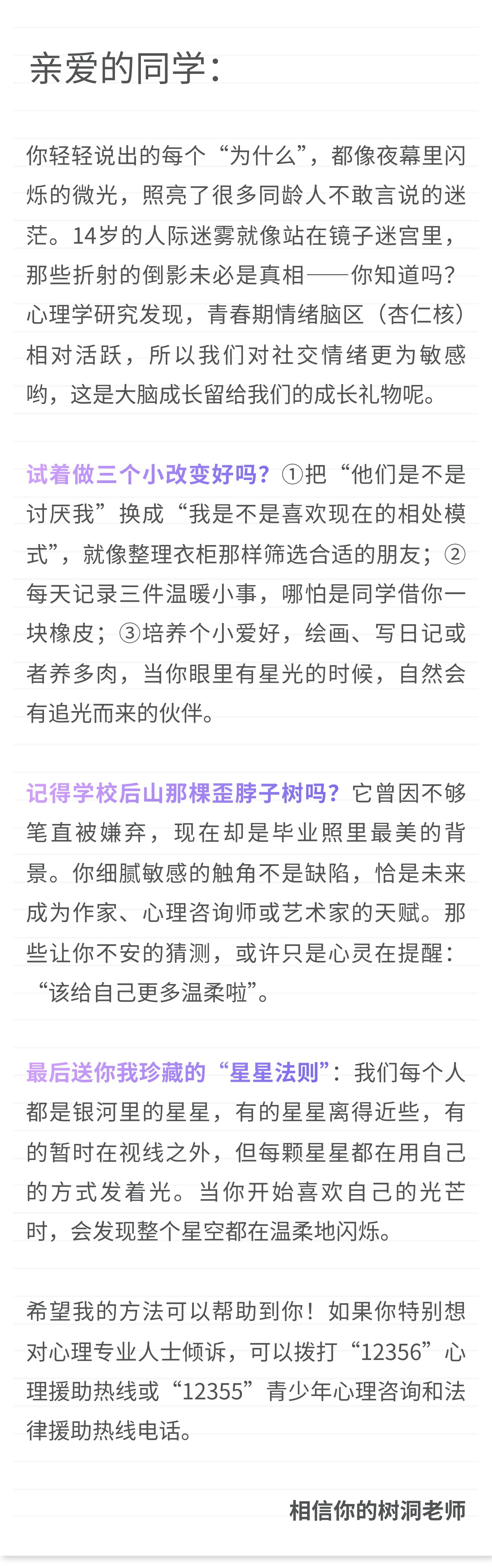 一位14岁初中女生来信:为什么人际关系那么难?为什么我总感觉他们会说我坏话?为什么我会感觉没有人真心对待?为什么我会感觉他们不是很愿意和我玩?
