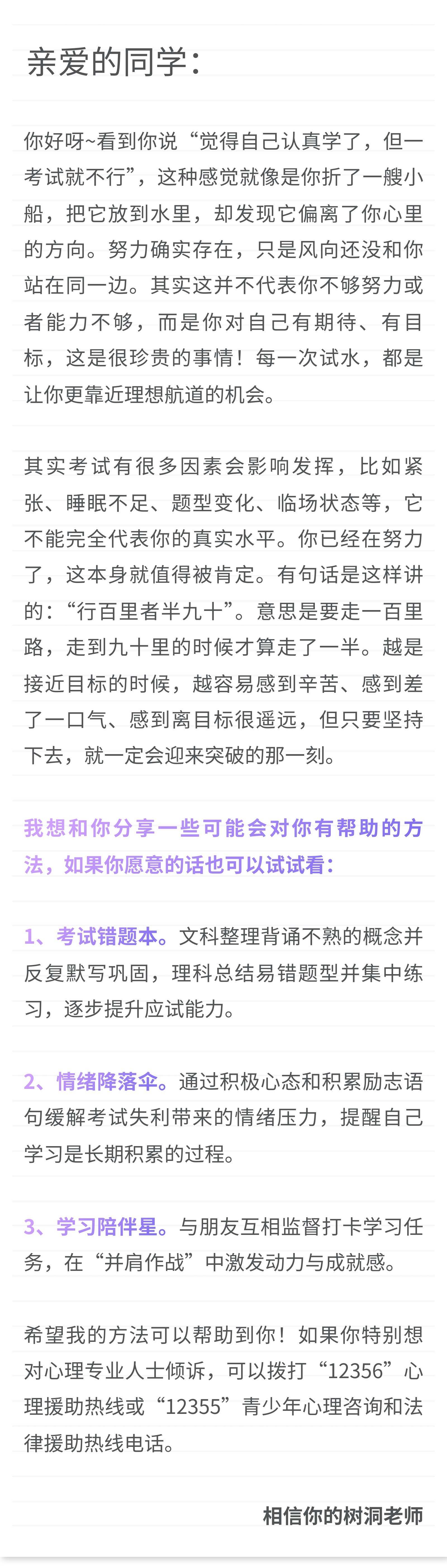 一位中学生:觉得自己认真学了但一考试就不行了,也不是不行吧,就是觉得没有考到自己所希望达到的目标