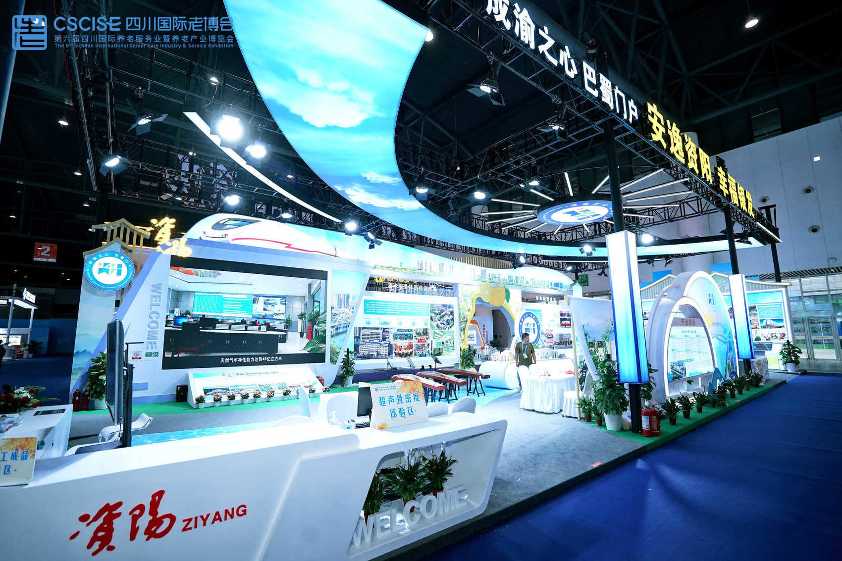 从外观上看,资阳馆融合了轨道交通、柠檬等元素,体现了资阳交通建设、城市发展、特色产业等情况;从展示内容上看,围绕“老有所为、老有所养、老有所安、老有所乐”,集中展示了文旅康养资源、养老服务发展成果、老年教育文化成果、地方服务品牌、地方特色产品等内容。