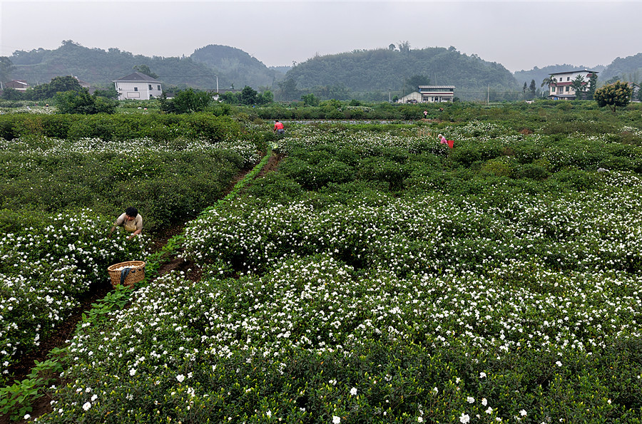 犍为县清溪镇灌引村的花农在采摘栀子花