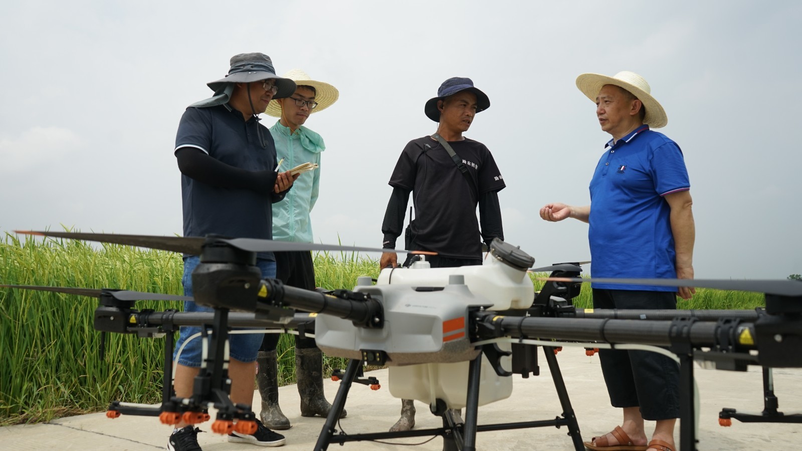 李平(右一)在与助手及无人机飞手研究杂交水稻制种无人机授粉技术。