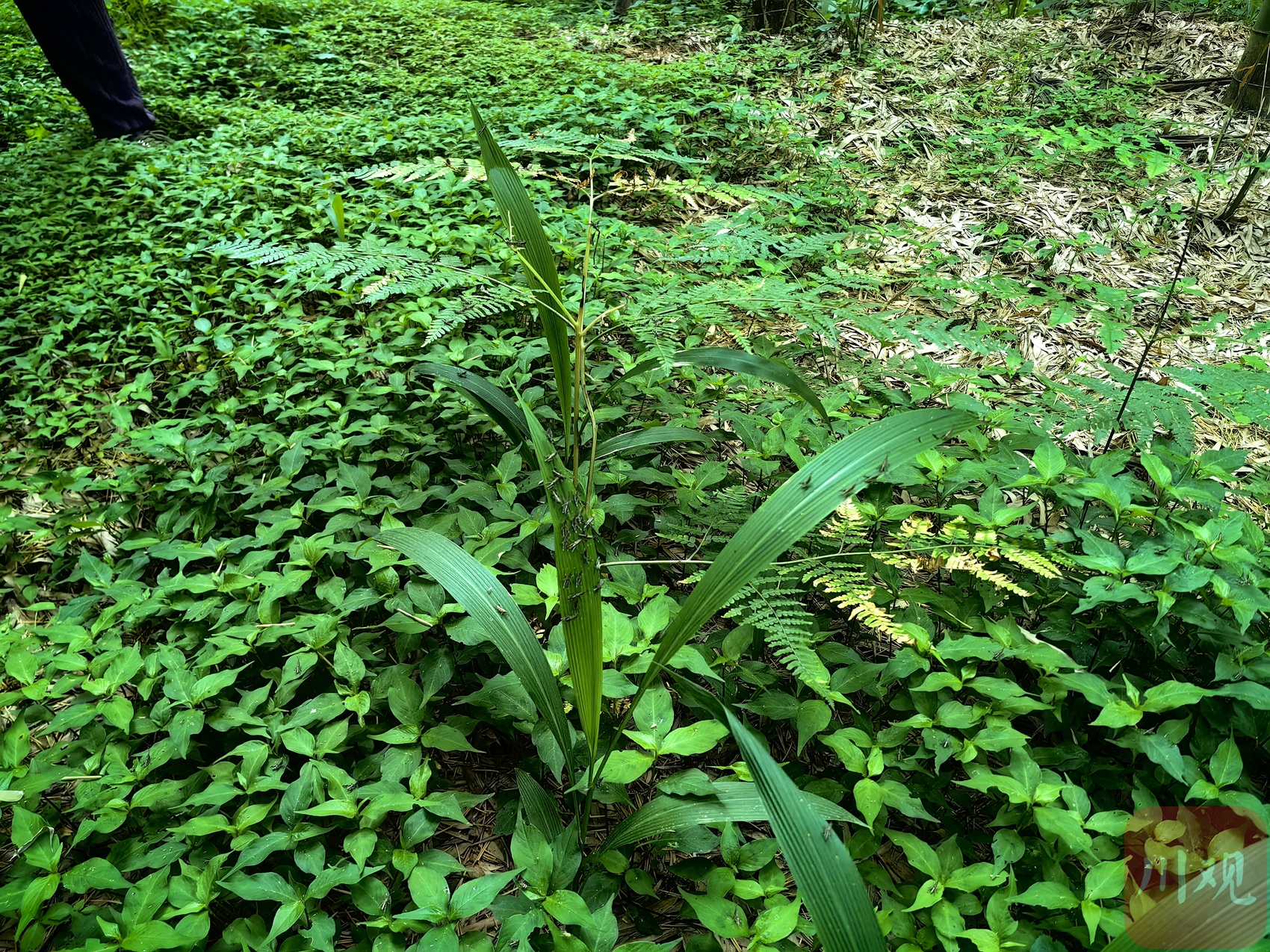 竹蝗虫密密麻麻地集中在竹林下的植被之上