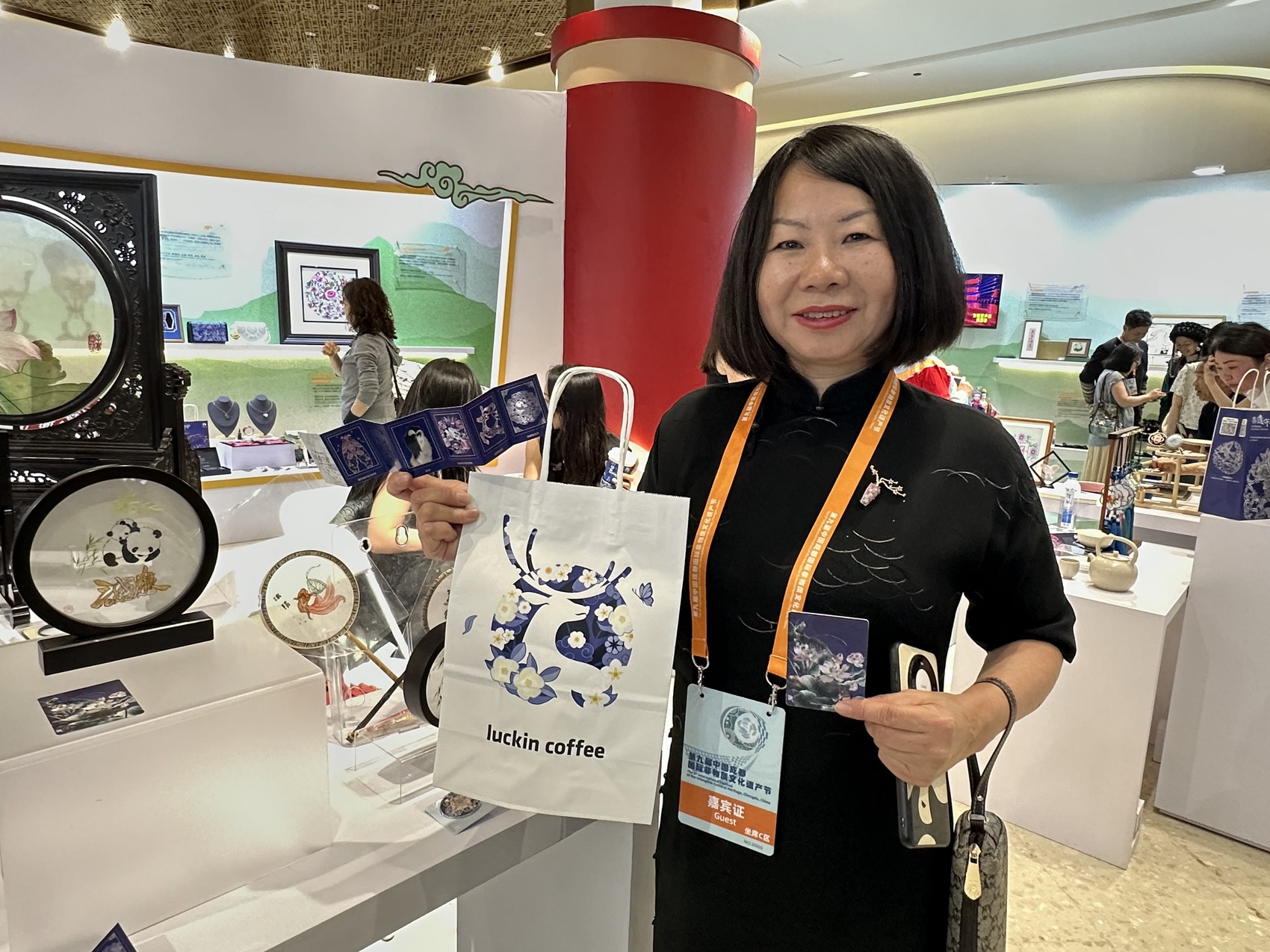 在蜀绣大师孟德芝工作室的展位上,可以看到蜀绣团扇等精美文创和蜀绣图案,“以前我们只知道埋头绣产品,还不太能理解非遗设计的文化价值。”孟德芝介绍,没想到一年多来,不断有客户找她进行IP授权,“如今已和瑞幸咖啡、泸州老窖以及'三国杀'游戏等合作,仅授权收入就超过上百万元。最关键的是,让我们手艺人感受到知识和手艺得到尊重。”
