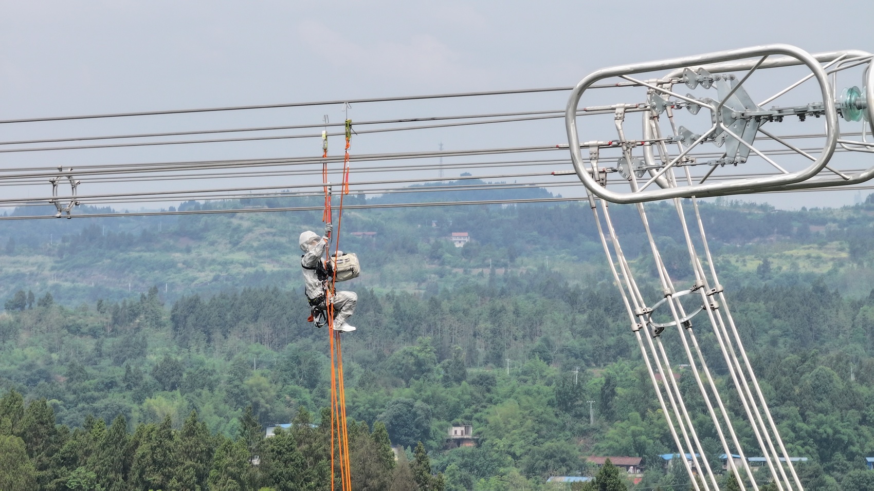 5月28日,资阳市雁江区,电力工人身着表面电压达1000千伏的绝缘屏蔽服,成功消除川渝1000千伏特高压交流工程天府南至成都东输电线路缺陷,标志着川渝特高压工程首次1000千伏带电作业顺利完成,这也是我国西南地区首次开展1000千伏特高压交流带电作业。