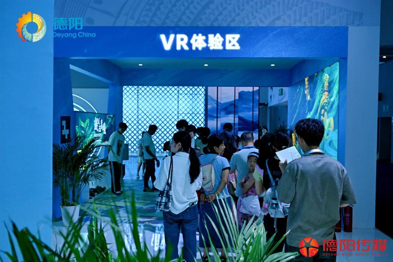 为了增强互动体验,德阳馆设置了三星堆VR互动体验区。这里热闹非凡,观众们排着长队,工作人员热情引导:“大家别着急,一个一个来,都能体验到三星堆的神秘魅力!”