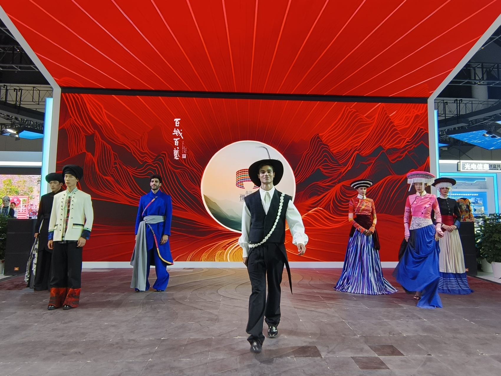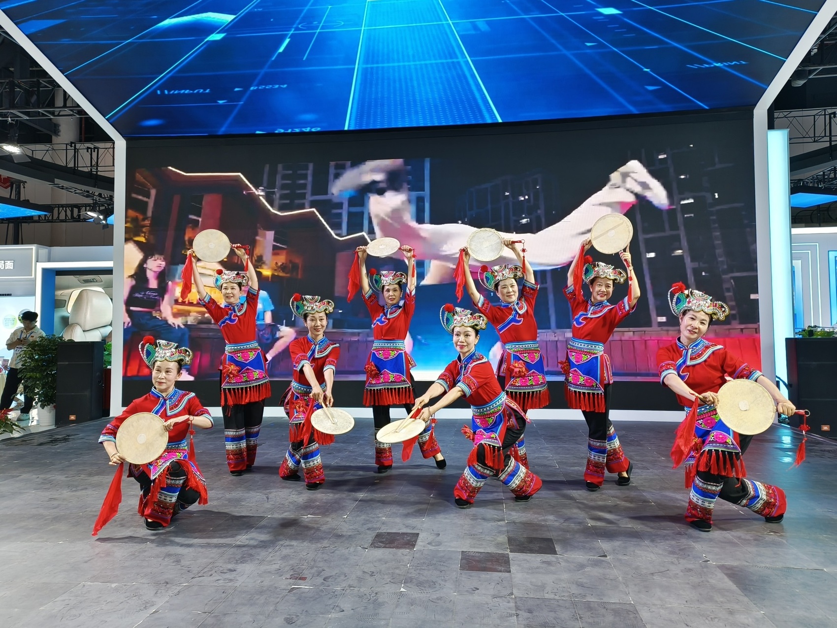 展区两侧,攀枝花的“软实力”和“硬实力”相得益彰,而在展区中间,展示的则是一场文艺盛宴。由羊皮鼓舞改编的彝族舞蹈《鼓舞声声木棉开》,省级非遗编舞《傈僳欢歌》,将攀枝花的文艺范儿尽情展现。身着绚丽民族服饰的表演者,将传统文化与现代时尚碰撞相融,走出了文化自信,也走出了攀枝花的自信。来自中国、突尼斯、巴西、美国等国家的模特,将盐边傈僳族服饰完美展示在世人眼前。“太美了,真切地理解了那句话,民族的就是世界的。”游客李虹君看了表演后连连称赞。