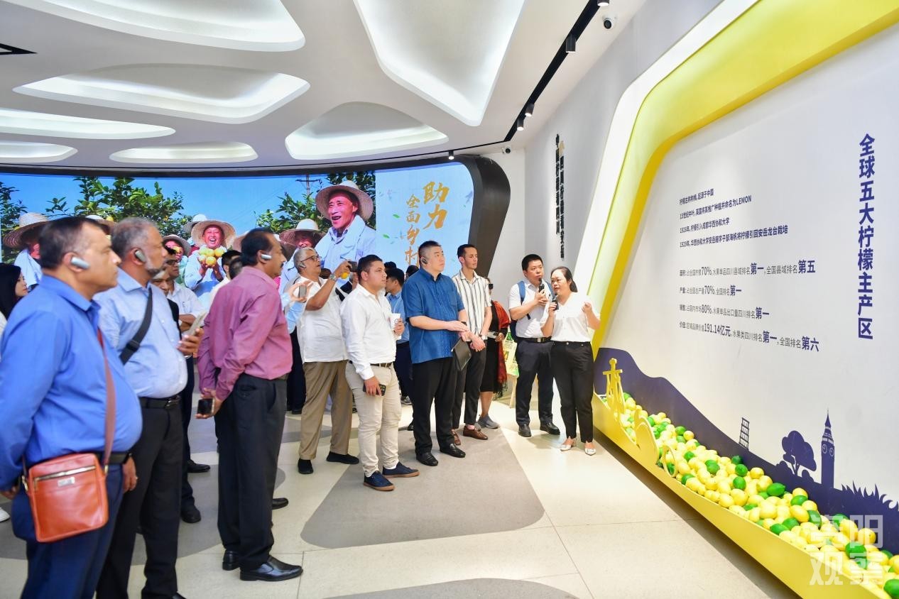 外宾们在安岳宝森柠檬园区展示馆聆听讲解。