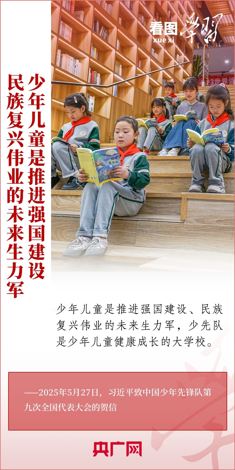 “少年儿童是推进强国建设、民族复兴伟业的未来生力军,少先队是少年儿童健康成长的大学校。”“六一”国际儿童节前夕,习近平总书记向中国少年先锋队第九次全国代表大会致信表示祝贺,强调“少先队要高举队旗跟党走,着眼于培养中国特色社会主义事业的合格建设者,教育引领广大少先队员争当爱党爱国、勤奋好学、全面发展的新时代好少年”,并祝全国的小朋友们节日快乐。