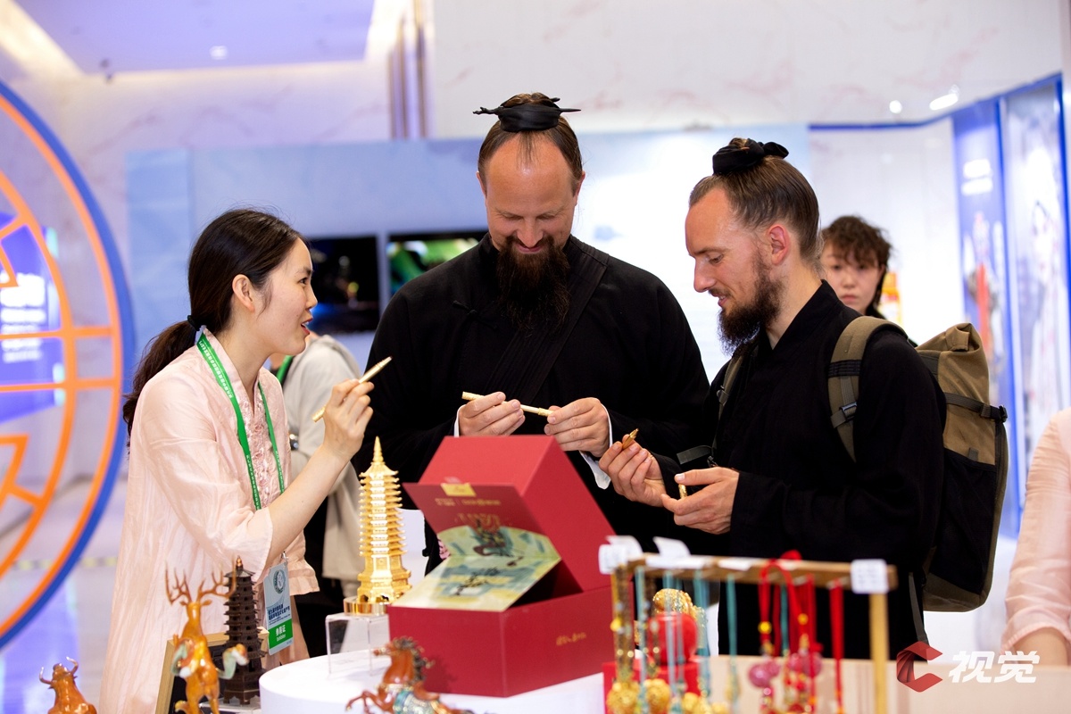 5月28日,成都国际非遗博览园的展厅内,两名外国友人对中国的文创笔很感兴趣。