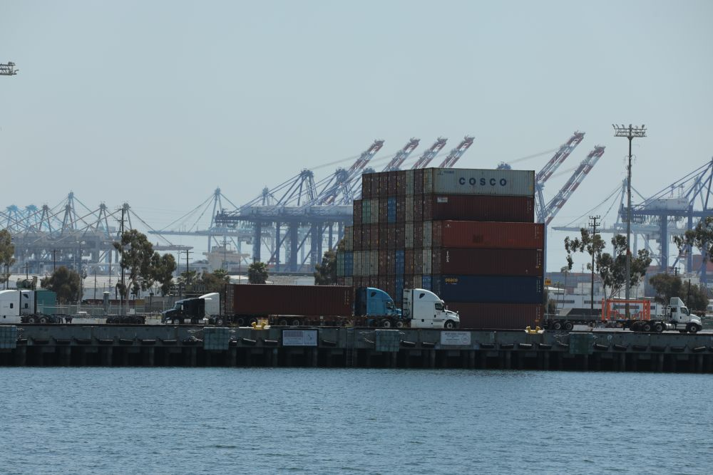 这是4月29日在美国洛杉矶港拍摄的集装箱和卡车。新华社发(邱晨 摄)