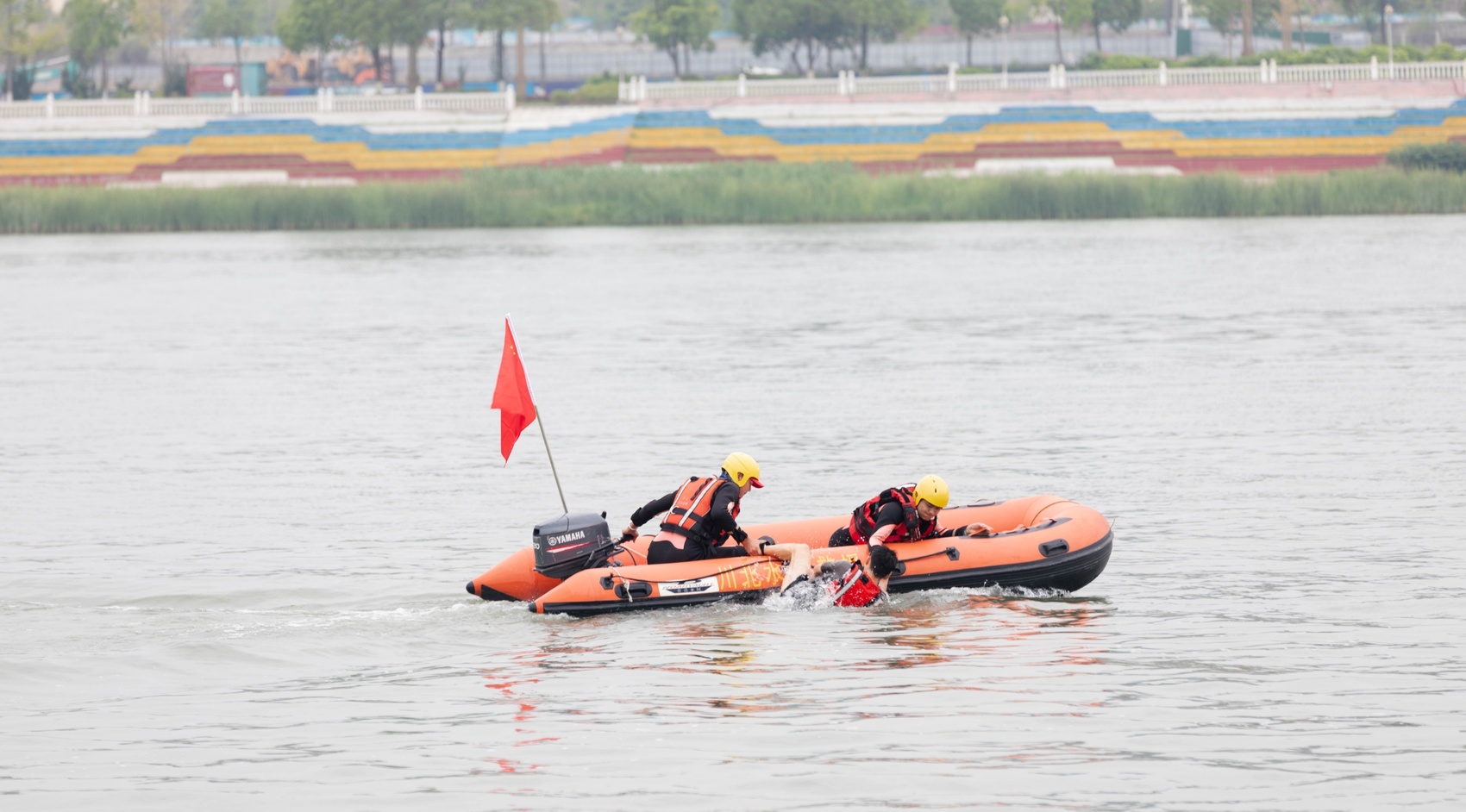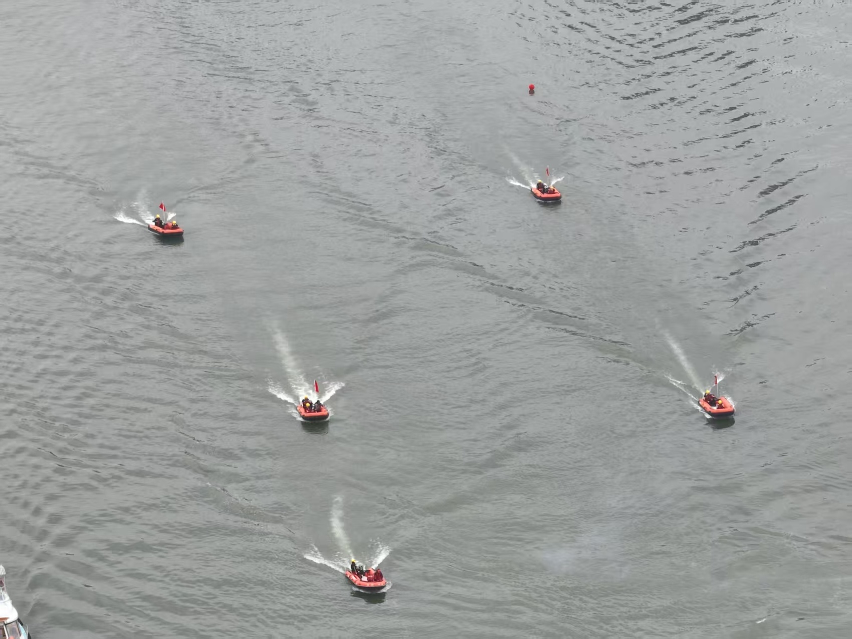 演练模拟了一场突发的水上事故:嘉陵江栖凤湖水域一艘作业船舶在强对流天气下,因阵性大风失控倾覆,3名船员瞬间落水,其中2人漂浮至江心挥手求救,1人随船倾覆后失踪,情况万分危急。