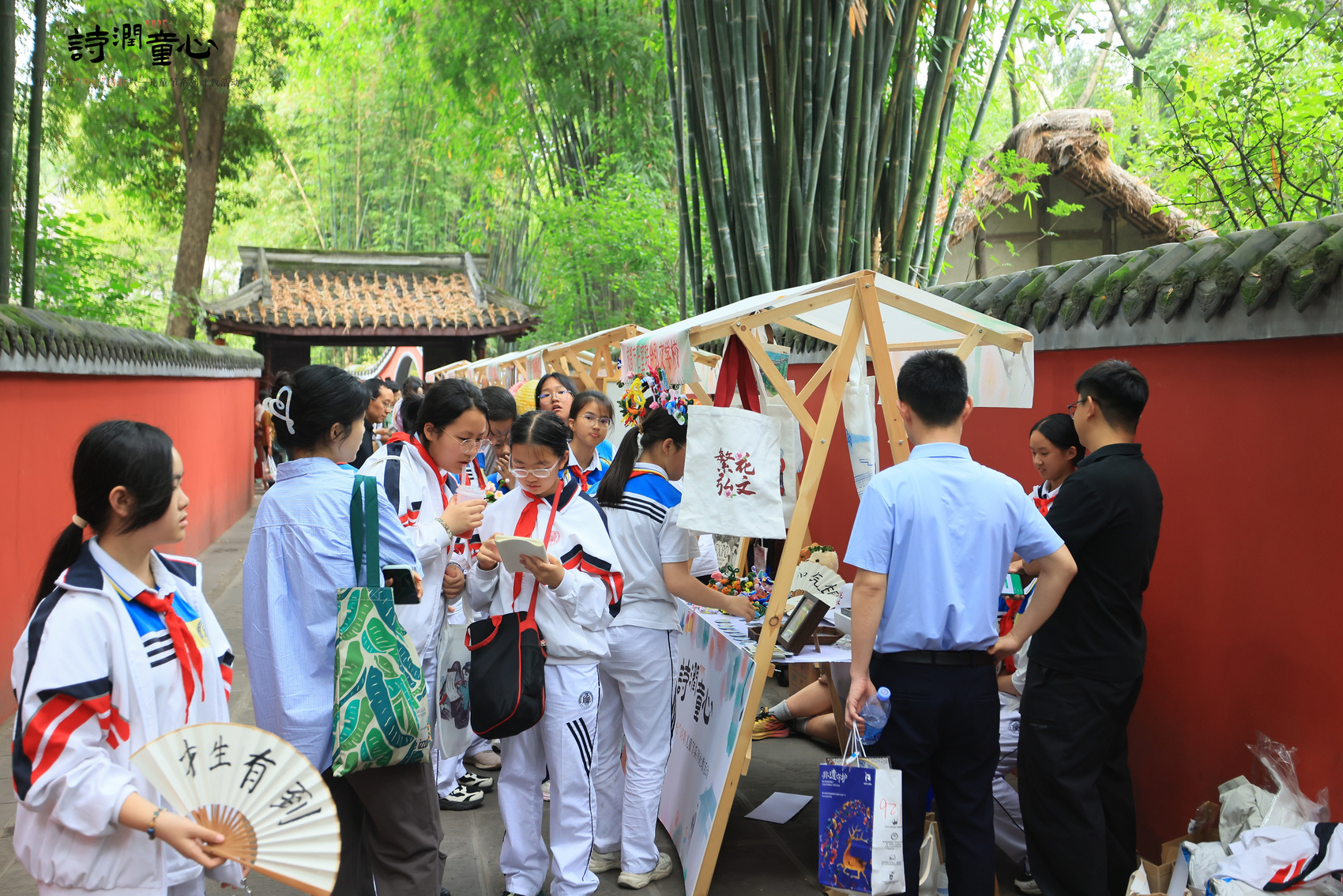 杜甫草堂各个旅游景点,还设置了21个互动摊位。孩子们化身“文化使者”,带领游客拓印杜诗碑刻、扎制竹编诗灯、剪裁纸艺画卷,共同感受传统技艺的魅力。