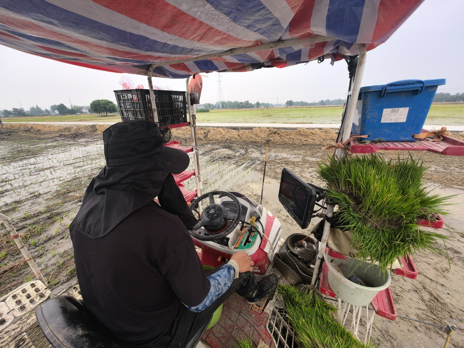 机手正驾驶搭载北斗卫星导航系统的插秧机插秧。