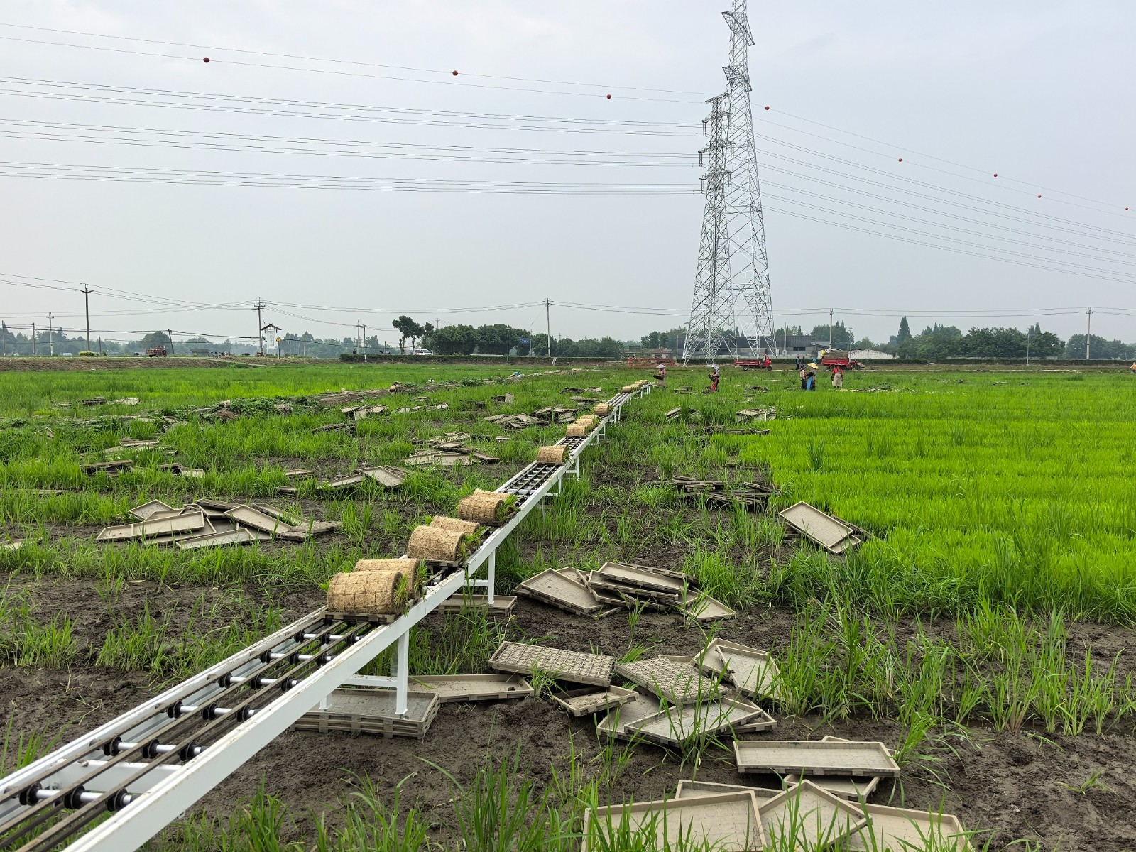 工人正在育秧田里取秧盘。