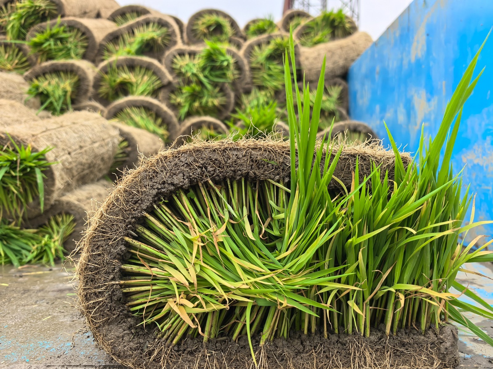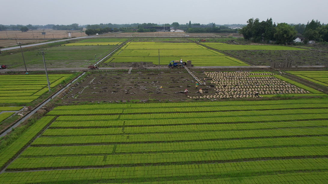 在旭成合作社的育秧田里,工人们动作娴熟地起秧盘、卷秧苗,将一卷卷秧苗快速放上传送带。陈勇随手展开一卷,只见秧苗整齐均匀,根系比蛛网还要稠密。
