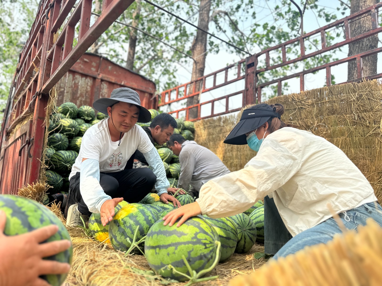 5月21日,安徽省宿州市萧县,苏鲁豫皖四省交界处的惠农果蔬大市场外,几辆满载新鲜西瓜的小三轮在一辆6.8米长小货车前停下。工人自动组成2组,将西瓜一个一个运上货车。在这里,记者见到了秦川、唐杨夫妇。