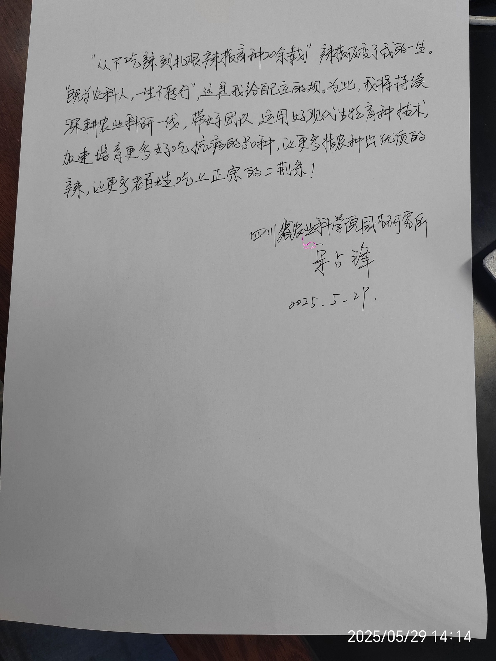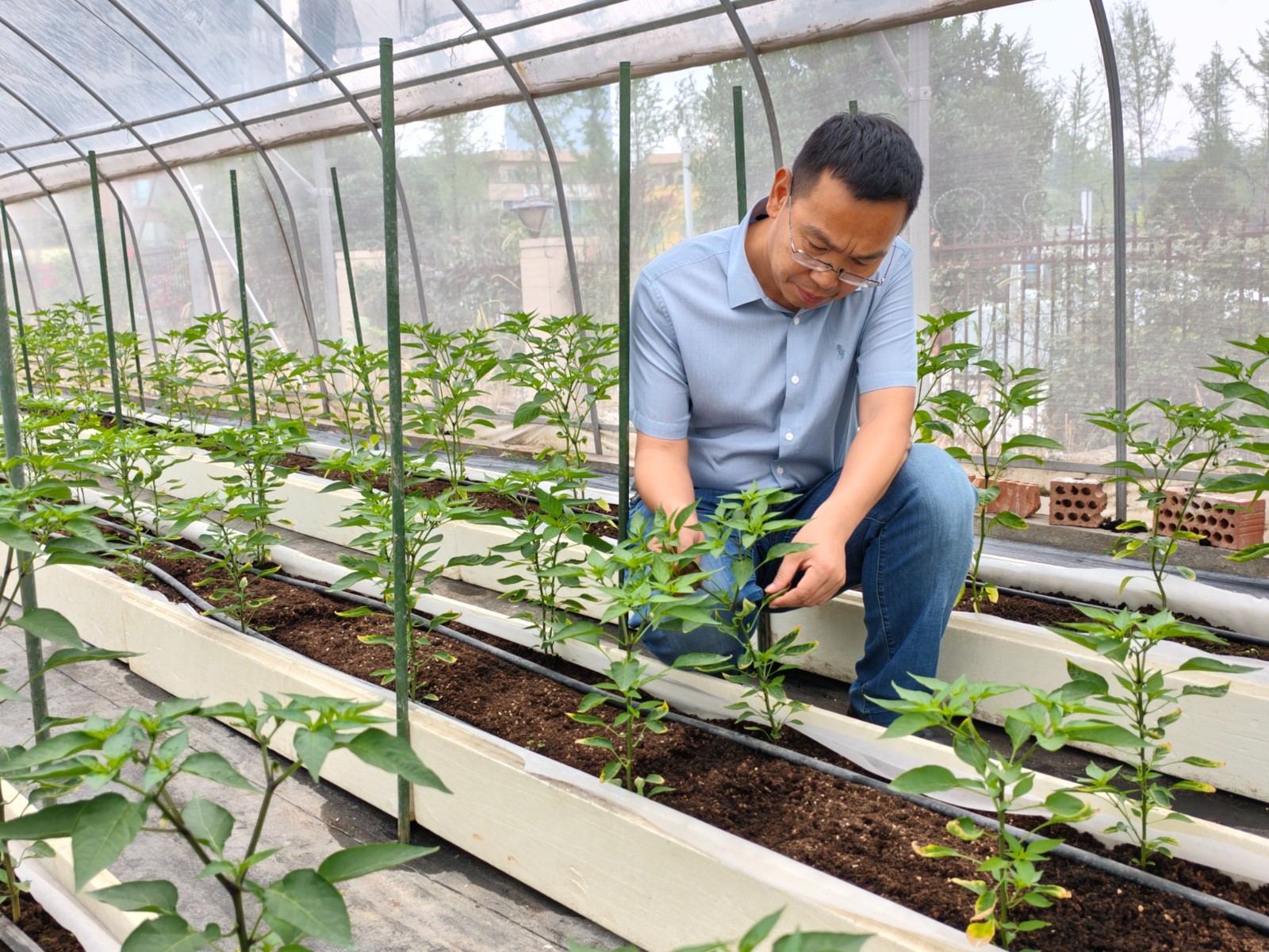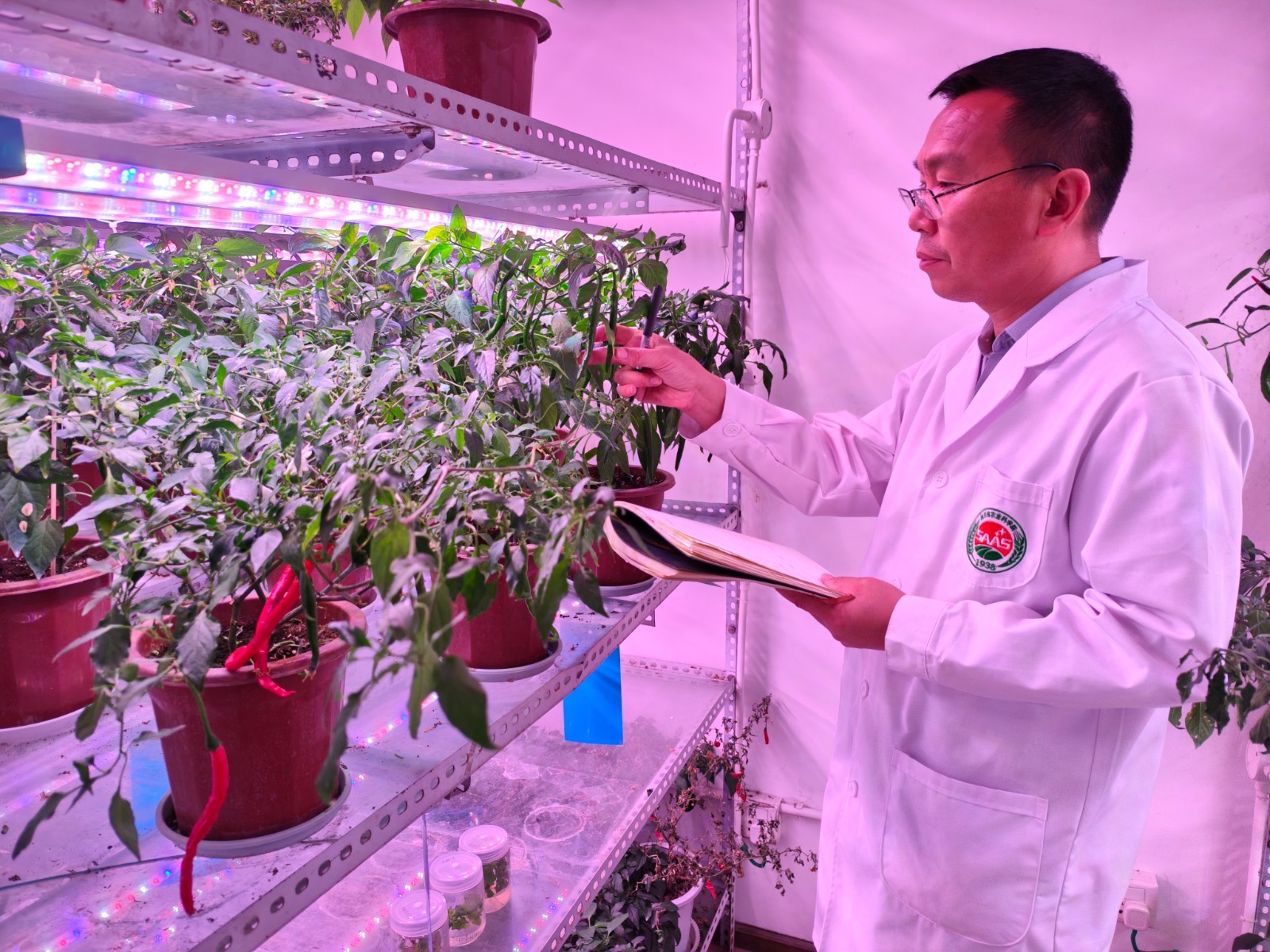 宋占锋说:“虽然辣椒给我带了不方便,但是辣椒对味蕾的刺激也让我对辣椒产生了更浓厚的兴趣,就下决心要把辣椒育种搞下去。首先学会吃辣椒,这对育种有帮助。因为,我们每年要种植上千份辣椒育种材料,都拿去专业机构检测辣度,费用太高,而科研经费却有限。如果能通过口尝,可以先排除不辣、低辣的材料,再送高辣的去检测,就大大减少了检测费用支出。只有精准把握核心育种材料的辣度,才可以加速我们培育高辣、低辣、微辣等不同类型品种。于是,我就从低辣的吃起,慢慢吃到中辣、高辣,现在我已习惯吃辣椒20多年,回家炒菜,不放豆瓣酱,吃饭没胃口。”