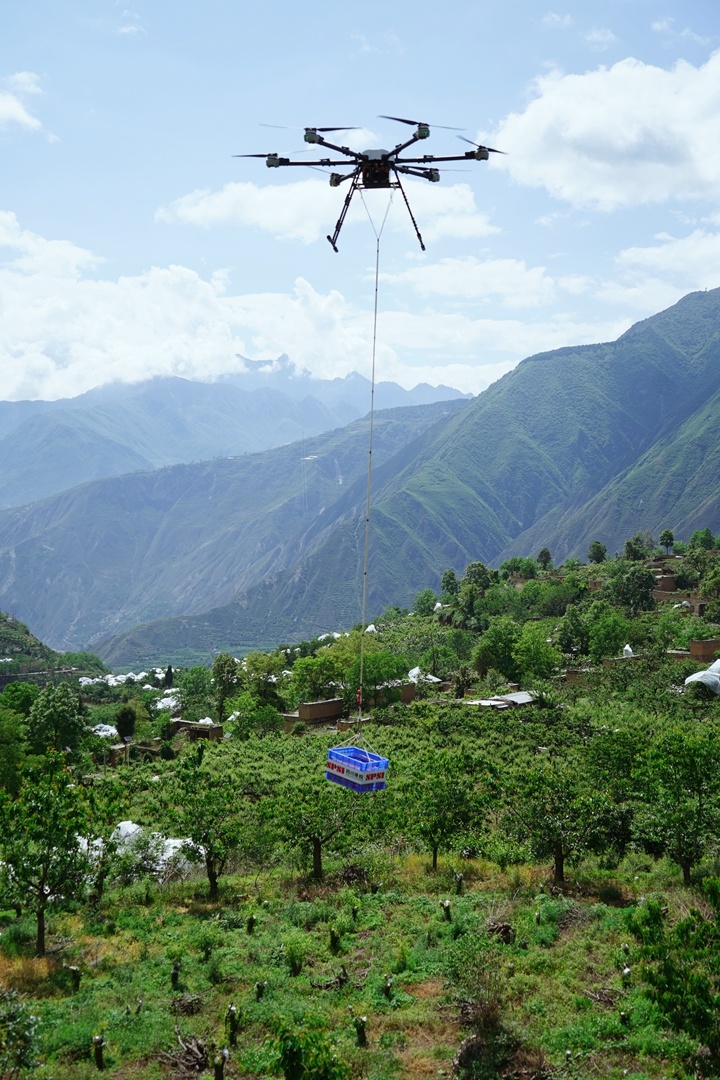 为解决这一难题,省低空经济公司采取“低空吊运+冷链运输”方式,启用单架次运载量50公斤的无人机,凭借峡谷地形自适应飞控技术,仅用不到5分钟便可以将山上的车厘子统一到集货点,再配合集货点等待的冷链物流公司冷链车,完成多式联运接力,实现“枝头鲜果24小时通达全国”,运输时效大幅提升,损耗率得到有效控制,预计每年为农户增收超15%。