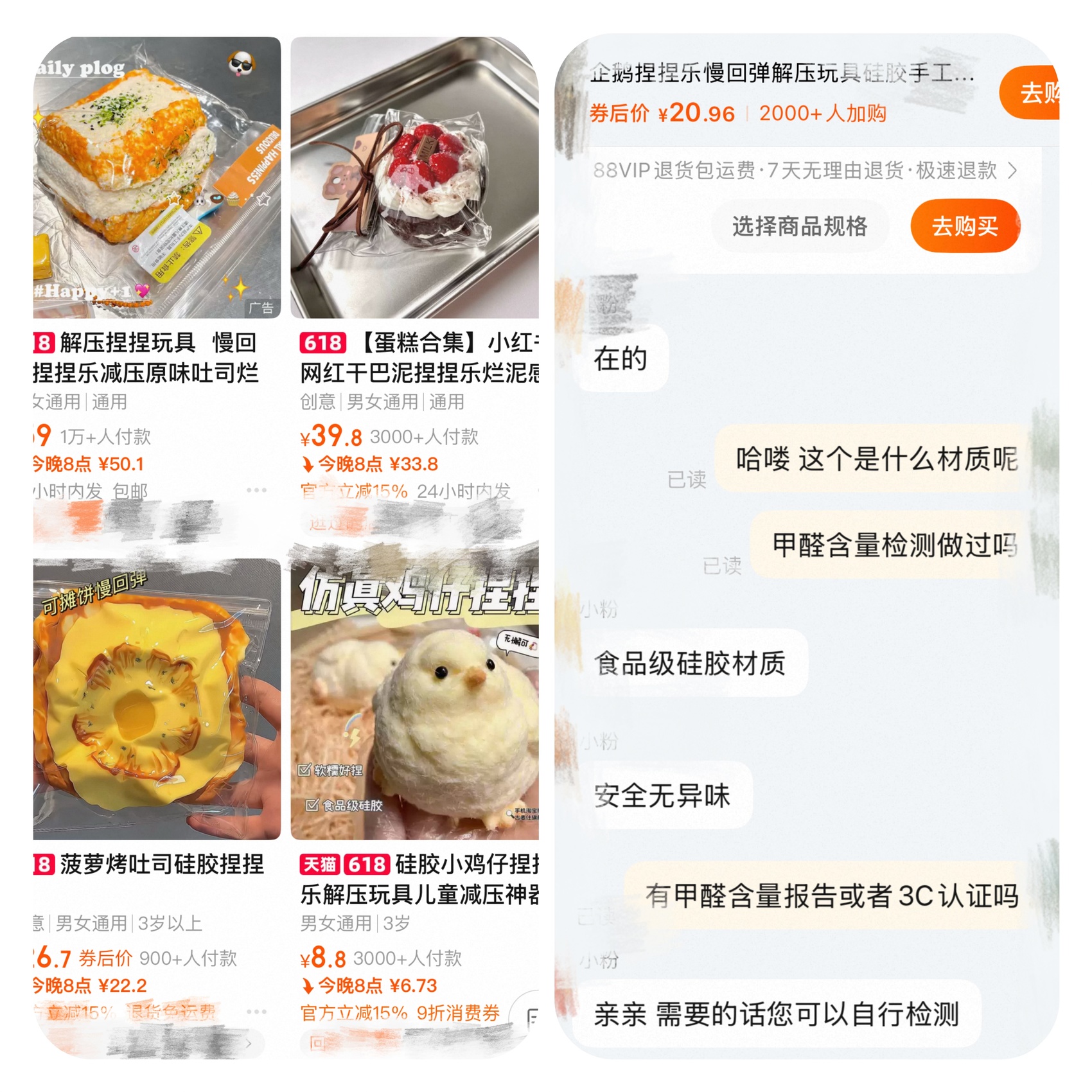 川观新闻记者发现,各大电商平台均有多款“捏捏”玩具在售,造型逼真,价格普遍在10元至50元之间。记者随机点进多家商店,发现多款食物造型的“捏捏”玩具销量均破万件,且商品好评率几乎都在99%以上,鲜少有人对其安全性提出质疑。不过,近一两个月,评论区开始频繁出现“有异味吗”之类的咨询信息。