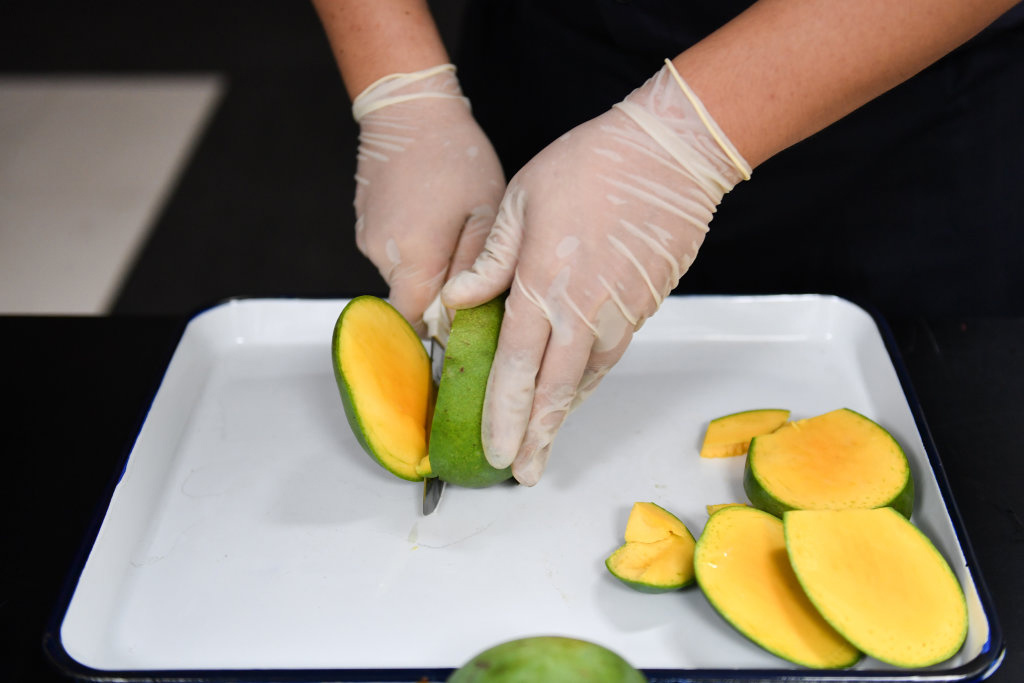 5月28日,长沙黄花机场海关关员对芒果进行剖果检查。