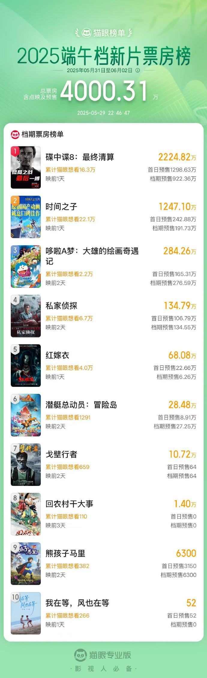 ▷据猫眼专业版数据,截至5月29日22时46分,2025年端午档新片预售总票房(含点映)破4000万,《碟中谍8:最终清算》持续领跑。