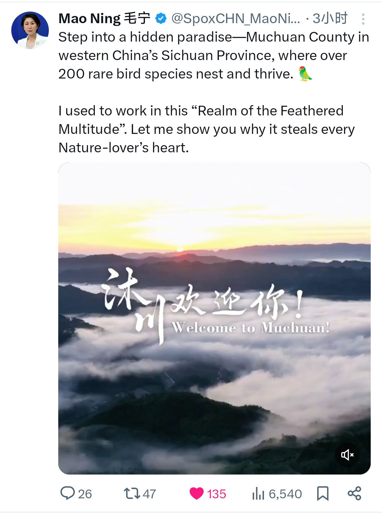 5月30日,外交部发言人毛宁在推特上向全球热情推介沐川生态美景,盛赞其“天然氧吧”和“观鸟天堂”,自然风景令人着迷。这一推介迅速引发海内外网友热烈反响,众多网友纷纷留言,为沐川的生态美景“打call”,沐川的珍稀鸟类和壮美景观再次成为全球关注的焦点。