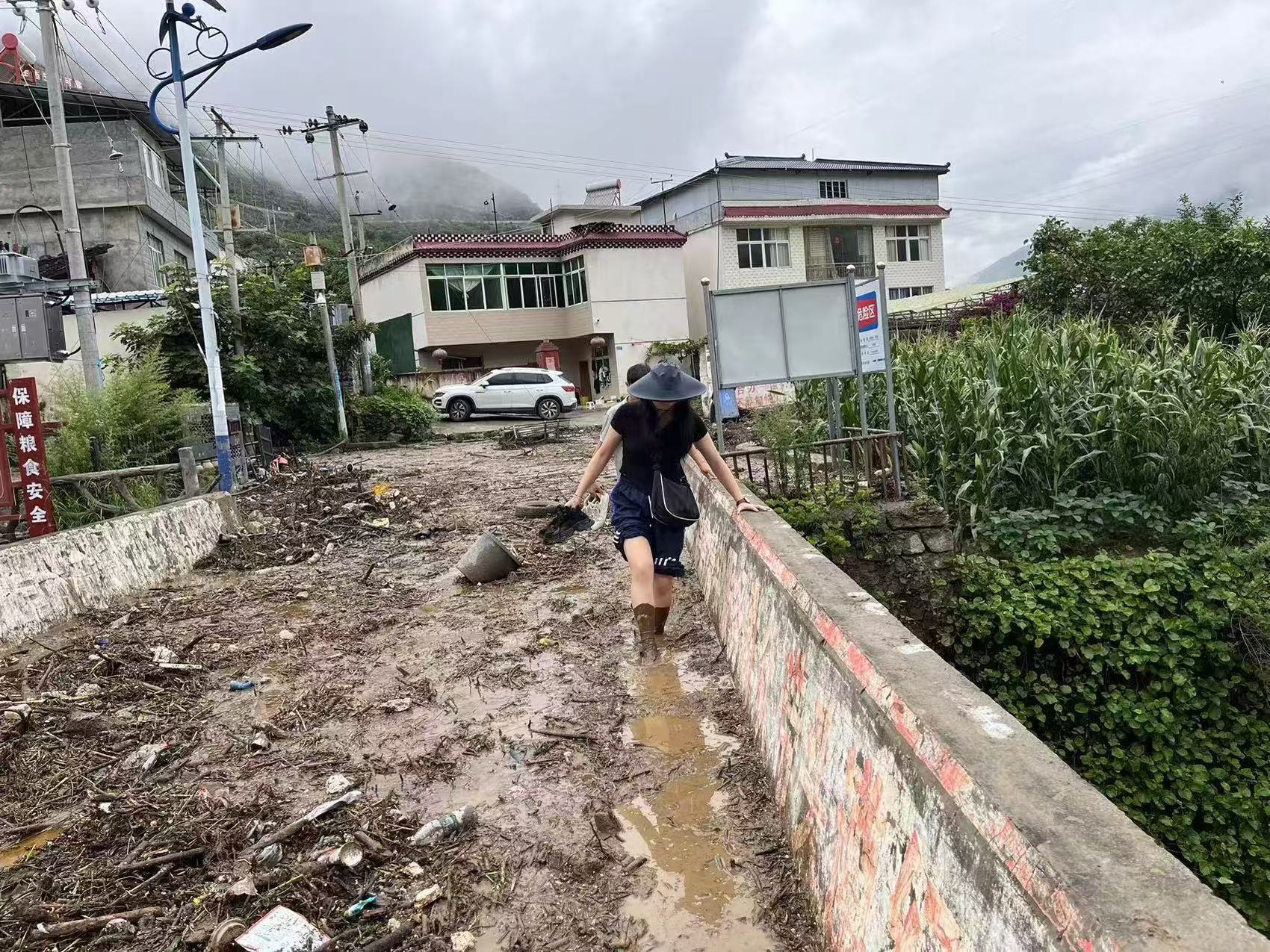 抵达现场时,赵家河桥沟已面目全非,泥石流裹挟着巨石和断木,将道路堵成一道“泥墙”。张紫瑶和其他村干部一起跳进泥浆,用铲子挖、用手刨,赶在夜晚到来前将道路疏通了。