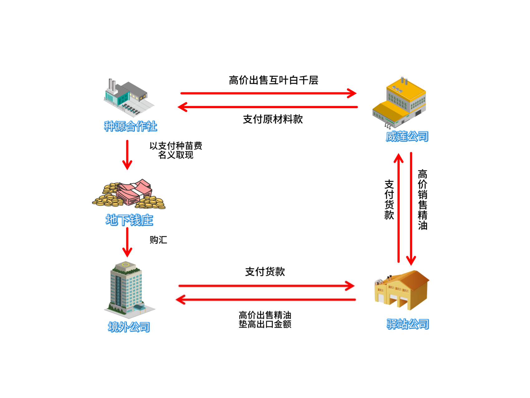 经进一步分析发现,威莲公司以互叶白千层为原材料生产精油,再将精油销售给泸州驿站科技有限公司(以下简称“驿站公司”),驿站公司再将精油高价出口境外某公司(以下简称“境外公司”)。不仅是原材料销售价格奇高,精油销售价格也是层层加码,高达同期市场价格的47倍,显然这已经不是正常的市场销售行为。检查人员还发现威莲公司和其上游种源合作社、下游驿站公司几乎同时注册成立。