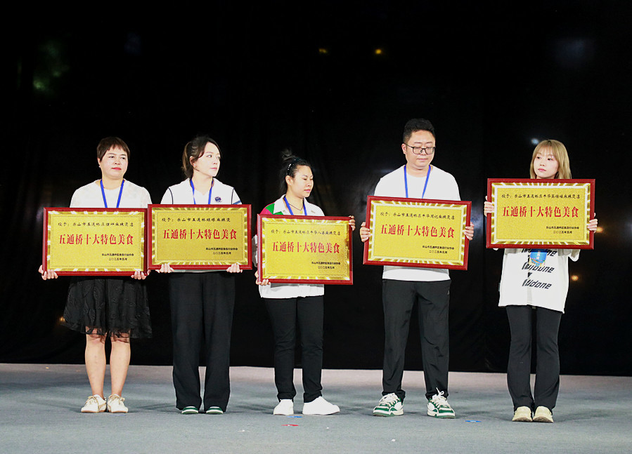 5月29日晚,“中国麻辣烫发源地”在五通桥揭牌后,八婆、绿缘、周记、嘉州飘香、摆神等5家牛华麻辣烫品牌的代表在掌声中走上领奖台。